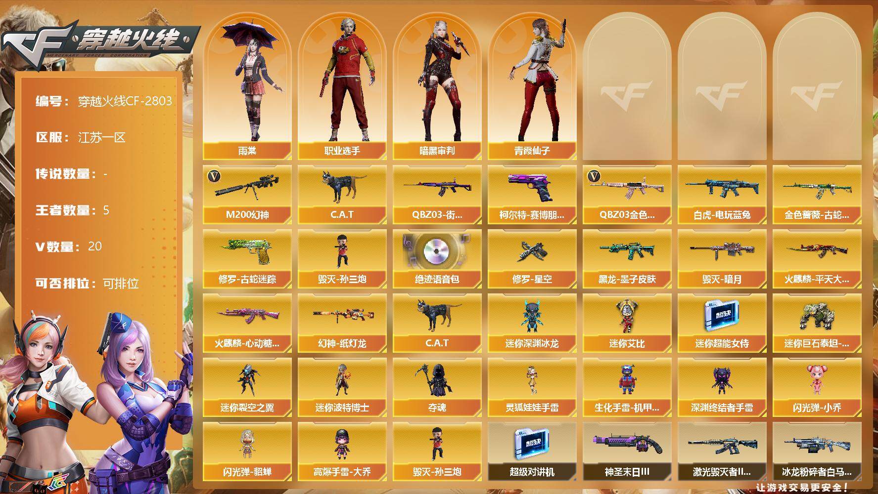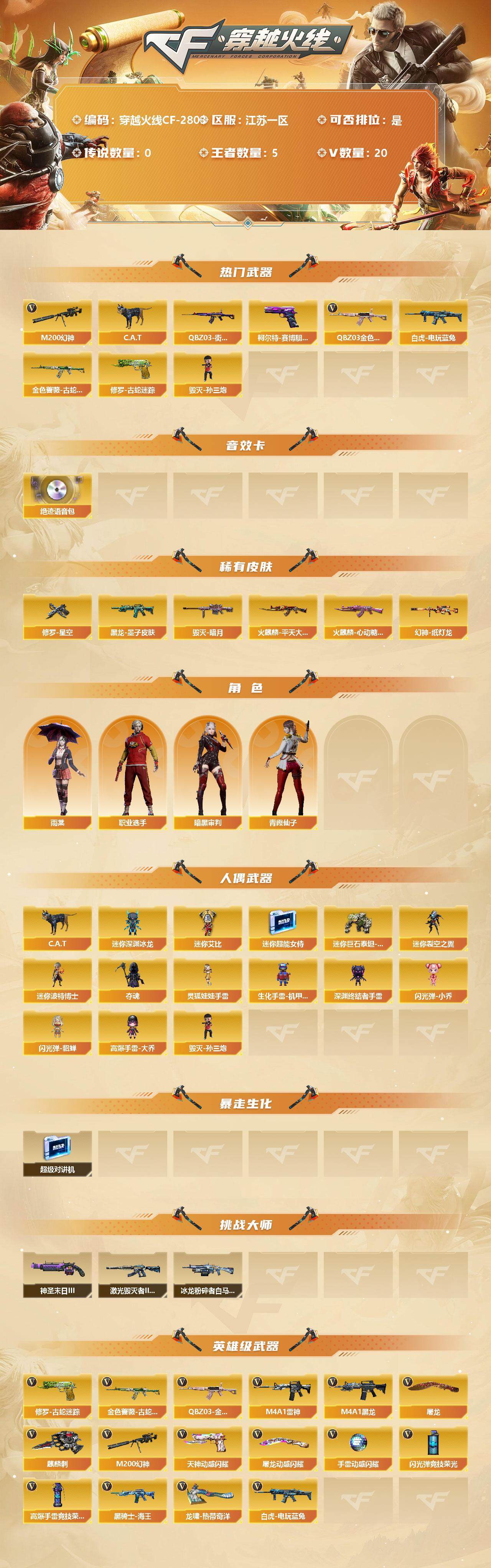 [12491667]【商品标题】:江苏一区-20V-5王者-0炫金 【热门武器】:QBZ03-金色蔷薇,M200-幻神,金色蔷薇-古蛇迷踪,修罗-古蛇迷踪,白虎-电玩蓝兔,QBZ03-街机,C.A.T,毁灭-孙三炮,柯尔特-赛博朋克 【音效卡】:绝迹语音包 【稀有皮肤】:幻神-纸灯龙皮肤,火麒麟-平天大圣,火麒麟-心动糖果,黑龙-墨子皮肤,毁灭-暗月,修罗-星空 【角色】:雨棠,职业选手,暗黑审判,青霞仙子 【人偶武器】:毁灭-孙三炮,C.A.T,迷你深渊冰龙,迷你艾比,迷你超能女侍,迷你巨石泰坦-魔花研究所,迷你裂空之翼,迷你波特博士,夺魂,灵狐娃娃手雷,生化手雷-机甲核心,深渊终结者手雷,闪光弹-小乔,闪光弹-貂蝉,高爆手雷-大乔 【暴走生化】:超级对讲机 【挑战大师】:神圣爆裂者-末日III,激光毁灭者III-白马银枪,冰龙粉碎者-白马银枪 【英雄级武器】:高爆手雷-竞技荣光,闪光弹-竞技荣光*4,天神-动感闪耀,屠龙-动感闪耀,手雷-动感闪耀,QBZ03-金色蔷薇,金色蔷薇-古蛇迷踪,白虎-电玩蓝兔,M4A1-雷神,M4A1-黑龙,M200-幻神,黑骑士-海王,修罗-古蛇迷踪,麒麟刺,屠龙,龙啸-热带奇洋 【特殊枪械】: