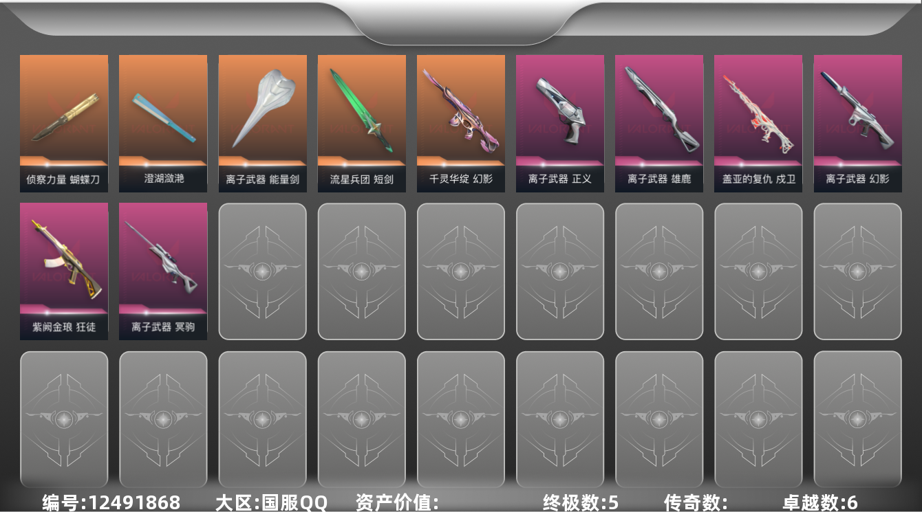 [12491868]【套装】:离子武器套装 【英雄】:幻棱,炼狱,维斯,暮蝶,钛狐,壹决,铁臂,捷风,雷兹,幽影,不死鸟,贤者,猎枭,蝰蛇,零,芮娜,奇乐,尚勃勒,霓虹,斯凯,K/O,盖可,黑梦 【近战 武器】:近战武器-侦察力量 蝴蝶刀,近战武器-澄湖潋滟,近战武器-离子武器 能量剑,近战武器-流星兵团 短剑 【狂徒】:狂徒-紫阙金琅,狂徒-流星兵团 【幻影】:幻影-千灵华绽,幻影-离子武器 【戍卫】:戍卫-盖亚的复仇,戍卫-战术熊与伙伴们 【冥驹】:冥驹-离子武器 【飞将】:飞将-战术熊与伙伴们 【莽侠】:莽侠-纤云弄巧 【奥丁】:奥丁-流星兵团 【雄鹿】:雄鹿-离子武器 【骇灵】:骇灵-流星兵团 【蜂刺】:蜂刺-纤云弄巧 【标配】:标配-超能偶像,标配-战术熊与伙伴们 【正义】:正义-离子武器,正义-纤云弄巧 【鬼魅】:鬼魅-流星兵团 【狂怒】:狂怒-战术熊与伙伴们 【短炮】:短炮-纤云弄巧 【卡面】:《双城之战》拥抱 卡面,精灵大战 卡面,欢迎来到底城 卡面,南瓜盛典 卡面,无畏契约:暮蝶 卡面,修车达人 卡面,正义的化身 卡面,终章:生意人麦宝 卡面,铁之华 卡面,时间到 卡面,最高舞台 卡面,声感陷阱设计图 卡面,梦幻奶茶 卡面,终章:打造专属狂徒 卡面,趁热吃 卡面,西装暴徒 卡面,失控边缘 卡面,哨卫者之领域 卡面,暮蝶工牌 卡面,战术熊与伙伴们 卡面,源能反应 卡面,流星兵团 卡面,纤云弄巧 卡面,暂别喧嚣 卡面,打造专属狂徒 卡面,零点嗅探设计图 卡面,无畏契约GO!第一卷:芮娜 卡面,清除名单 卡面,无畏契约GO!第一卷:零 卡面,代号红色 卡面,新兵报到 卡面,V契约 卡面,无畏契约 卡面 【喷漆】:嘭! 喷漆,都算到了 喷漆,控场勿近 喷漆,伤心心 喷漆,熊抱 喷漆,超级粉丝 喷漆,捷风差距 喷漆,惊声尖叫 喷漆,2021冠军巡回赛花火 喷漆,拼一枪 喷漆,加油!加油! 喷漆,开心到爆炸 喷漆,皮蛋萌舞 喷漆,我觉得不行 喷漆,头号粉丝 喷漆,吸一口快乐 喷漆,永远的答案 喷漆,再来一次? 喷漆,别挡我的路! 喷漆,我的刀呢? 喷漆,当然可以 喷漆,流星兵团 喷漆,战术熊与伙伴们 喷漆,禁止喷漆 喷漆,纤云弄巧 喷漆,双击点赞 喷漆,买装还是存钱 喷漆,胜利属于无畏契约 喷漆,GLHF 喷漆,无畏契约 喷漆 【挂饰】:《双城之战》小蛋糕 挂饰,第九季//第三