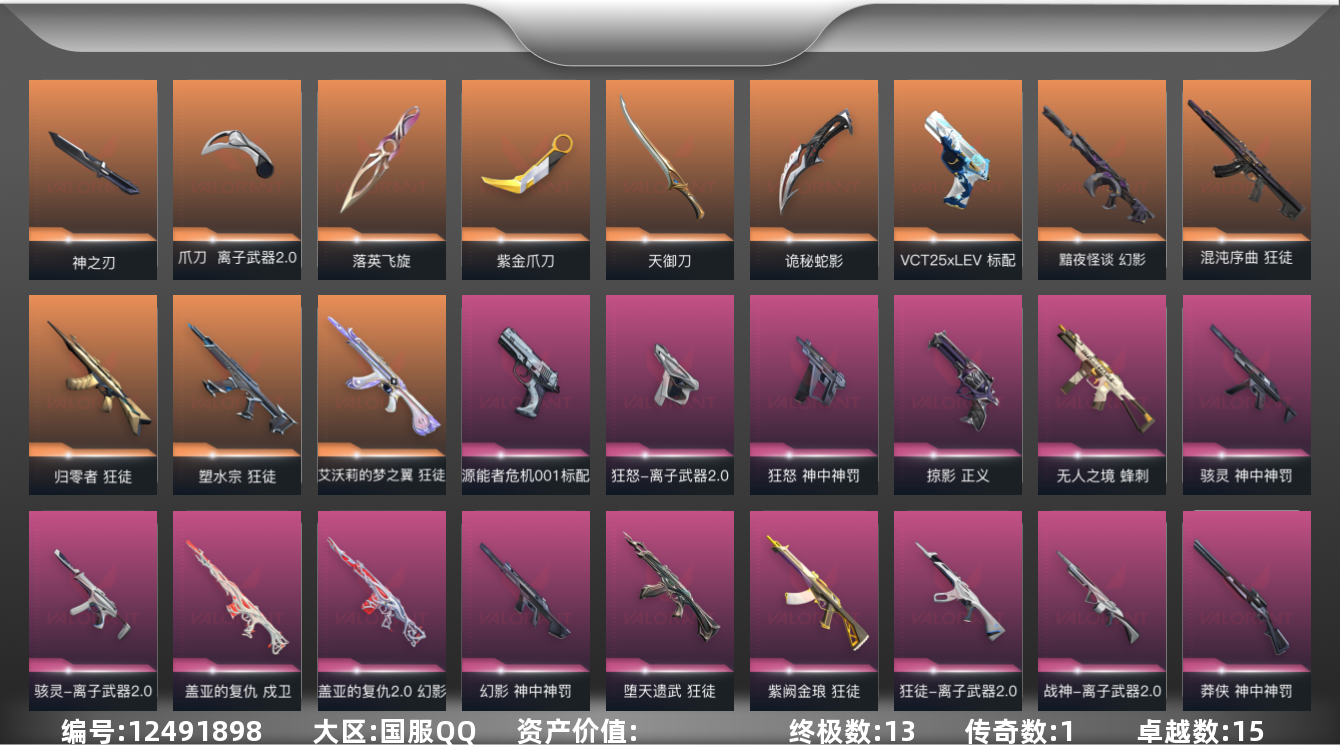 [12491898]【套装】:离子武器//2.0套装,神中神罚套装 【英雄】:幻棱,炼狱,维斯,暮蝶,钛狐,壹决,捷风,雷兹,不死鸟,贤者,猎枭,蝰蛇,零,芮娜,奇乐,斯凯,夜露,K/O,盖可,黑梦,钢锁 【近战 武器】:近战武器-紫金爪刀,近战武器-神之刃,近战武器-落英飞旋,近战武器-离子武器//2.0 爪刀,近战武器-天御刀,近战武器-诡秘蛇影 军刀 【狂徒】:狂徒-艾沃莉的梦之翼,狂徒-归零者,狂徒-混沌序曲,狂徒-塑水宗,狂徒-堕天遗武,狂徒-紫阙金琅,狂徒-离子武器//2.0,狂徒-诡秘蛇影 【幻影】:幻影-黯夜怪谈,幻影-盖亚的复仇//2.0,幻影-神中神罚,幻影-末日之翼 【戍卫】:戍卫-盖亚的复仇,戍卫-折光棱晶 【獠犬】:獠犬-星航勇进 【冥驹】:冥驹-虎魄春明 【飞将】:飞将-末日之翼 【莽侠】:莽侠-神中神罚,莽侠-诡秘蛇影 【战神】:战神-离子武器//2.0 【奥丁】:奥丁-末日之翼 【判官】:判官-诡秘蛇影 【骇灵】:骇灵-离子武器//2.0,骇灵-神中神罚 【蜂刺】:蜂刺-无人之境,蜂刺-折光棱晶 【标配】:标配-源能者危机001,标配-折光棱晶 【VCT手枪】:标配-VCT25 x LEV 【正义】:正义-掠影 【鬼魅】:鬼魅-诡秘蛇影 【狂怒】:狂怒-离子武器//2.0,狂怒-神中神罚 【短炮】:短炮-末日之翼 【卡面】:热舞环节 卡面,树懒大作战 卡面,红鳞松叶 卡面,沙雕爆能器 卡面,无畏契约GO!第一卷:芮娜 卡面,无畏契约GO!第一卷:零 卡面,无垠星环 卡面,《双城之战》金克丝 卡面,钢锁vs盖可 卡面,代号红色 卡面,新兵报到 卡面,V契约 卡面,无畏契约 卡面 【喷漆】:审判之爪 喷漆,买装还是存钱 喷漆,关门放狗 喷漆,放下武器 喷漆,胜利属于无畏契约 喷漆,GLHF 喷漆,无畏契约 喷漆 【挂饰】:无畏契约GO!第一卷 芮娜 挂饰,薰衣草之心 挂饰,动力机箱 挂饰,招财猫熊 挂饰,天外飞客 挂饰,红鳞松叶 挂饰,《双城之战》魄罗 挂饰,盆栽小友 挂饰,无畏契约 纪念币 挂饰