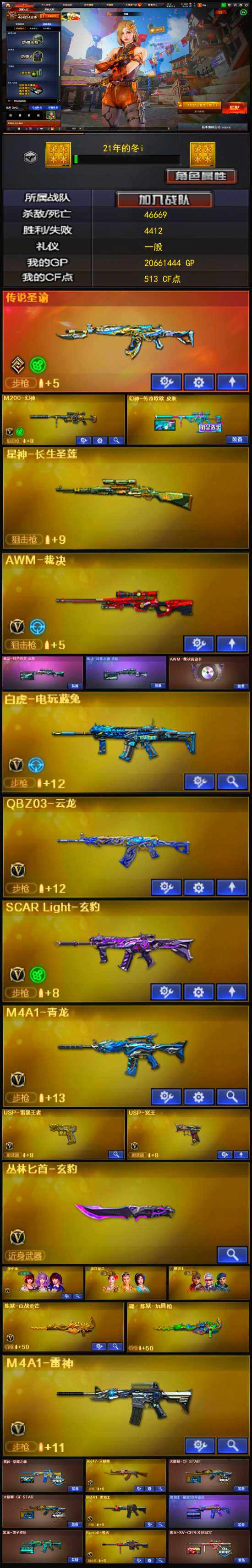 - [13118114]山东一区-154V-11王者-1炫金 【传说武器】:传说梦魇,传说灵眸 【热门武器】:传说梦魇,传说灵眸,G36C-幻影,QBZ03-金色蔷薇,M14EBR-玄武,Scar Light-白虎,HK417-朱雀,M4A1-青龙,M200-幻神*2,M200-竞技荣光,凤吟之魄,白虎-电玩蓝兔,柯尔特-冠军之特,金色小号,Cat-刀锋,牛牛-AK47,M4A1-黑骑士*3,汤姆逊-烈龙*6,RPK-盘龙*4,加特林-炼狱*2,斯泰尔-蝴蝶,羊驼玩偶,雷神-小红,裁决-雪莉杨,COP-白鲨,USP-雷暴*2,COP 357-幻灵*2,沙鹰-修罗*7,Knife-冠军之刃*2,炽芒蝶刃,黄金猫猫手套-白鲨,金刚伞 【王者炫金武器】:凤吟之魄,王者玄武,炫金天龙 【音效卡】:M200-幻神音效卡,M4A1-黑骑士音效卡,Barrett-毁灭音效卡,AWM-裁决音效卡,Scar Light-白虎音效卡,绝迹语音包,HK417-朱雀音效卡,女战神梧桐语音包 【皮肤】:M200-幻神-黄忠皮肤,幻神-冠军之幻,幻神-宠儿-2021MVP,M200-幻神-荣耀世冠白鲨,M200-幻神-N9-2022MVP,白虎-白鲨-CFPLS23冠军,QBZ03-冠军之薇,QBZ03-AG-CFPLS19冠军,AWM-裁决-凤灵皮肤,裁决-巅峰荣耀 皮肤,雷神-暗月*2,雷神-荣耀之魄,雷神-传奇N9,雷神-宠儿-2019MVP,雷神-机甲刑天皮肤,雷神-宇航兔皮肤,雷神-炽焰魔龙,雷神-云海游龙皮肤,雷神-源计划2.0专属 皮肤,火麒麟-平天大圣*2,火麒麟-虎牙平台皮肤,火麒麟-心动糖果,毁灭-黑大圣皮肤*2,M4A1-千变-孔明皮肤,黑骑士-暗月,黑骑士-CFS2021,黑骑士-AG-S4冠军典藏,无影-能量核心,战神-紫绶金章皮肤,战神-流金岁月皮肤*2,极光-能量核心,修罗耀金皮肤,修罗-冠军之魂,修罗-15周年嘉年华 皮肤,天神-暗月,屠龙-荣耀之锋,屠龙-QQ会员,屠龙-星火燎原,麒麟刺-萌杀皮肤 【角色】:魅影,春,影豹,电竞教官-云悠悠,雾萌萌,隐,战地猎狐,王者-瞳-闭月羞花,奇洋探员,乔伊教练,云海玲珑,空,暗夜-X,初恋灵狐,飞虎队-X,风暴女,虎妞,嘉年华灵狐,娟娟,兰-新年限定,灵动武士,灵狐者-X,灵狐者-七夕宝贝,龙儿-小淘气,曼陀罗-X,曼陀罗-礼服,女主播,潘