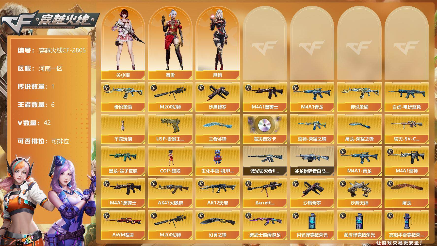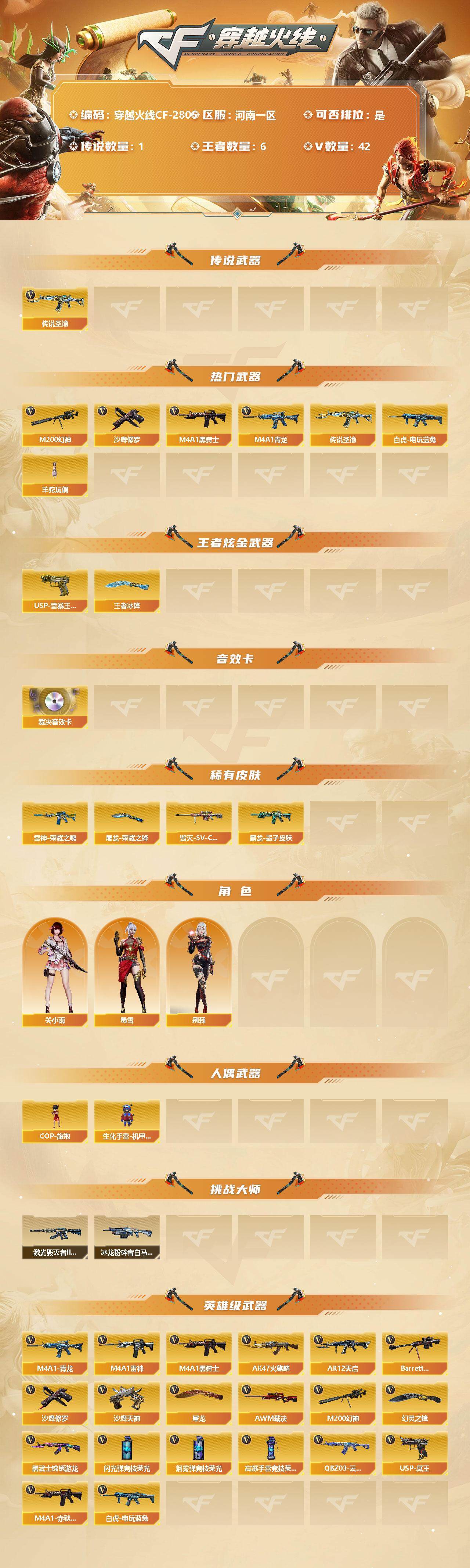 [12491943]【商品标题】:河南一区-42V-6王者-0炫金 【传说武器】:传说圣谕 【热门武器】:传说圣谕,M4A1-青龙,M200-幻神,白虎-电玩蓝兔,M4A1-黑骑士,羊驼玩偶,沙鹰-修罗 【王者炫金武器】:USP-雷暴王者,王者冰锋 【音效卡】:AWM-裁决音效卡 【稀有皮肤】:雷神-荣耀之魄,黑龙-墨子皮肤,毁灭-SV-CFPLS16冠军,屠龙-荣耀之锋 【角色】:关小雨,荆棘,蜀雪 【人偶武器】:COP-旗袍,生化手雷-机甲核心 【挑战大师】:激光毁灭者III-白马银枪,冰龙粉碎者-白马银枪 【英雄级武器】:QBZ03-云龙,高爆手雷-竞技荣光,烟雾弹-竞技荣光,闪光弹-竞技荣光*2,幻灵之锋,M4A1-青龙,白虎-电玩蓝兔,M4A1-雷神,M4A1-黑骑士,AK47-火麒麟,AK12-天启,Barrett-毁灭,AWM-裁决,M200-幻神,黑武士-锦绣游龙,M4A1-赤狱骑士,USP-冥王,沙鹰-天神*2,沙鹰-修罗,屠龙 【特殊枪械】:1黑骑士