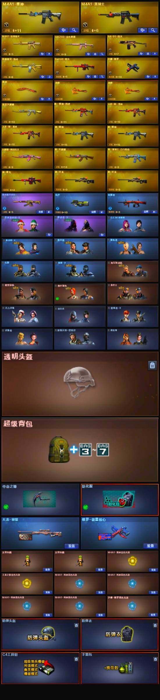 【英雄级武器】:QBZ03-金色蔷薇,M4A1-雷神,M4A1-玫瑰精灵,M4A1-黑骑士,Barrett-极光,沙鹰-修罗,龙啸*2,屠龙