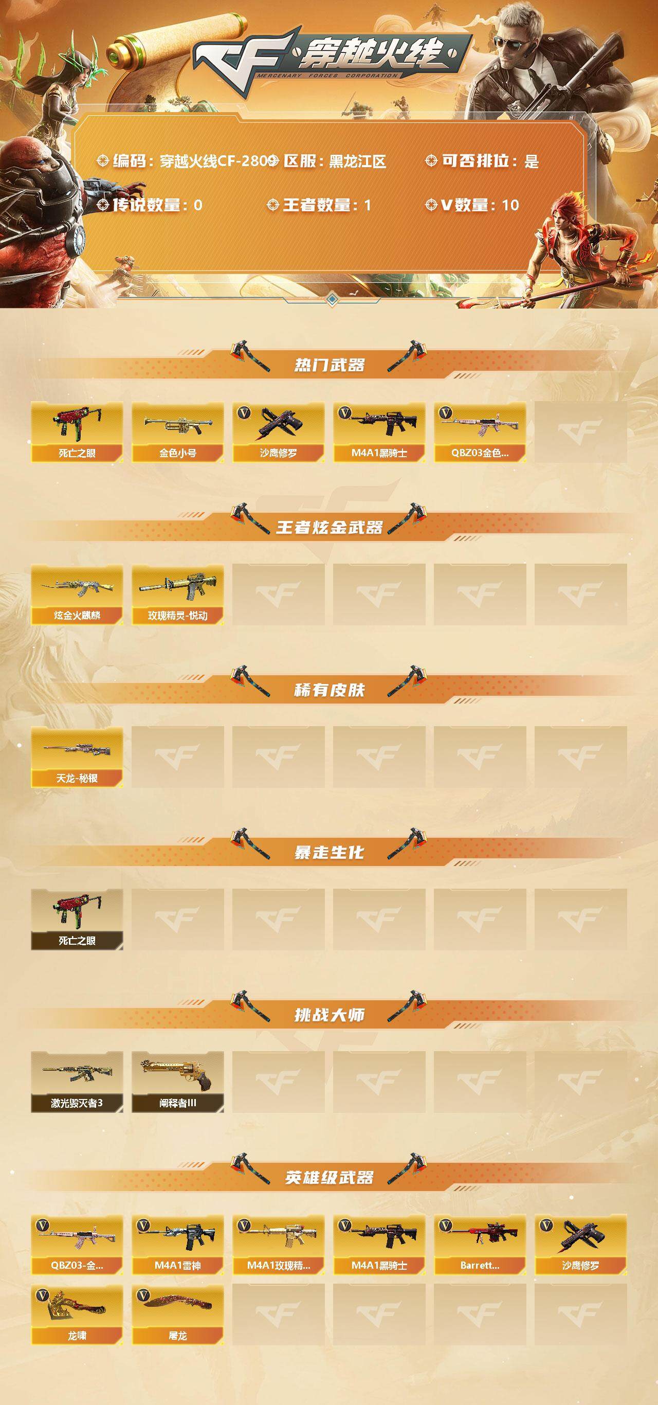 [12492787]【商品标题】:黑龙江区-10V-1王者-1炫金 【热门武器】:QBZ03-金色蔷薇,死亡之眼,金色小号,M4A1-黑骑士,沙鹰-修罗 【王者炫金武器】:炫金火麒麟,玫瑰精灵-悦动 【稀有皮肤】:天龙-秘银 【暴走生化】:死亡之眼 【挑战大师】:阐释者III,激光毁灭者III 【英雄级武器】:QBZ03-金色蔷薇,M4A1-雷神,M4A1-玫瑰精灵,M4A1-黑骑士,Barrett-极光,沙鹰-修罗,龙啸*2,屠龙 【特殊枪械】:1黑骑士