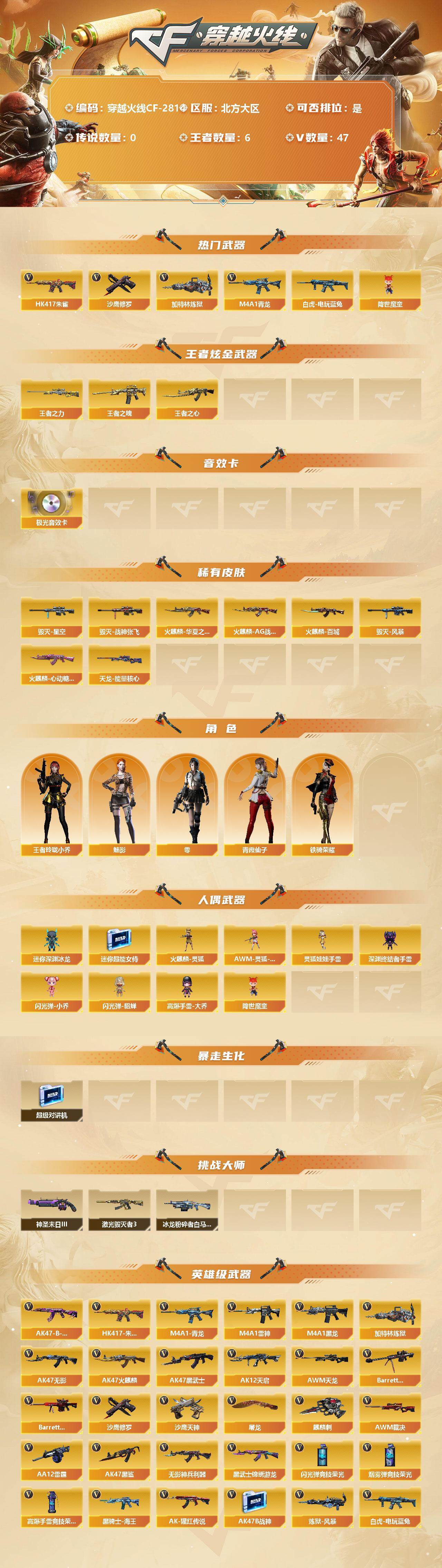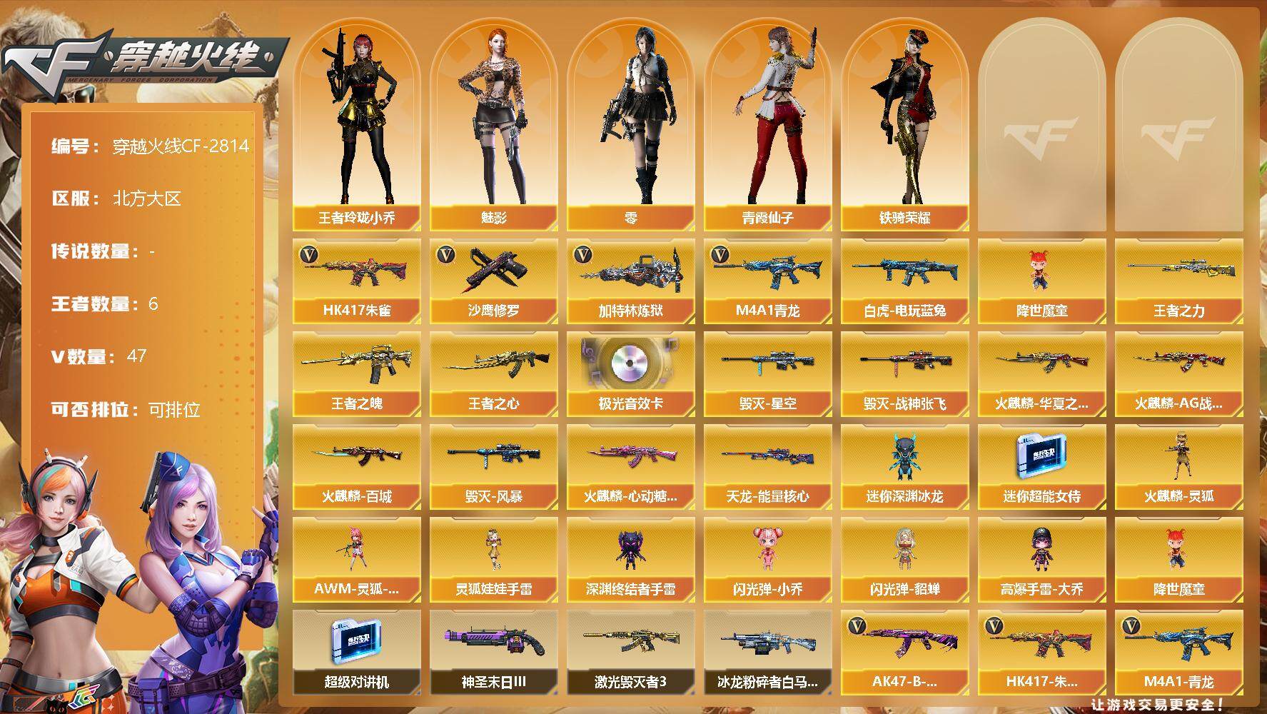 [12493382]【商品标题】:北方大区-47V-6王者-0炫金 【热门武器】:HK417-朱雀,M4A1-青龙,白虎-电玩蓝兔,加特林-炼狱*2,降世魔童,沙鹰-修罗*3 【王者炫金武器】:王者之力,王者之魄,王者之心 【音效卡】:Barrett-极光音效卡 【稀有皮肤】:火麒麟-AG战队皮肤,火麒麟-华夏之心,火麒麟-百城,火麒麟-心动糖果,毁灭-星空,毁灭-战神张飞,毁灭-风暴,天龙-能量核心 【角色】:王者玲珑-小乔,零,魅影,铁骑荣耀,青霞仙子 【人偶武器】:降世魔童,火麒麟-灵狐*2,AWM-灵狐-15周年嘉年华*2,迷你深渊冰龙,迷你超能女侍,灵狐娃娃手雷*2,深渊终结者手雷*2,闪光弹-小乔,闪光弹-貂蝉,高爆手雷-大乔 【暴走生化】:超级对讲机 【挑战大师】:神圣爆裂者-末日III,激光毁灭者III,冰龙粉碎者-白马银枪 【英雄级武器】:高爆手雷-竞技荣光,烟雾弹-竞技荣光,闪光弹-竞技荣光,HK417-朱雀,M4A1-青龙,白虎-电玩蓝兔,无影-神兵利器,M4A1-雷神,M4A1-黑龙,加特林-炼狱*2,AK47-无影,AK47-火麒麟,AK47-黑武士,AK12-天启,AWM-天龙,Barrett-毁灭,Barrett-极光,AWM-裁决,AA-12-雷霆,AK47-黑鲨*2,黑武士-锦绣游龙,黑骑士-海王,AK-47-猩红传说,AK47-B-战神*2,AK47-B-常胜将军*2,炼狱-风暴,沙鹰-天神,沙鹰-修罗*3,麒麟刺,屠龙*3 【特殊枪械】:2炼狱