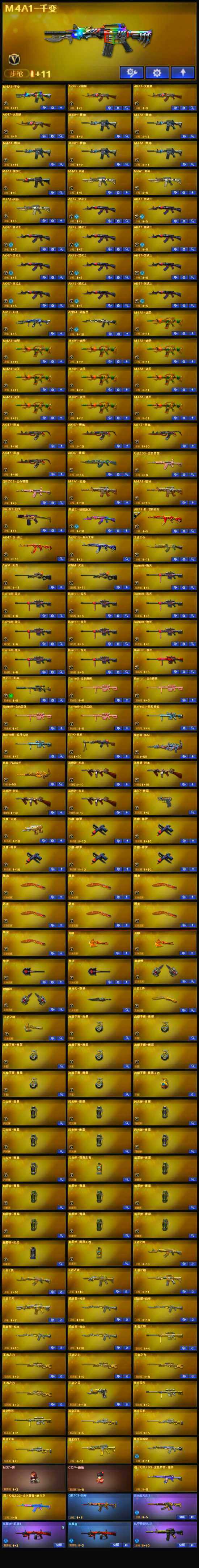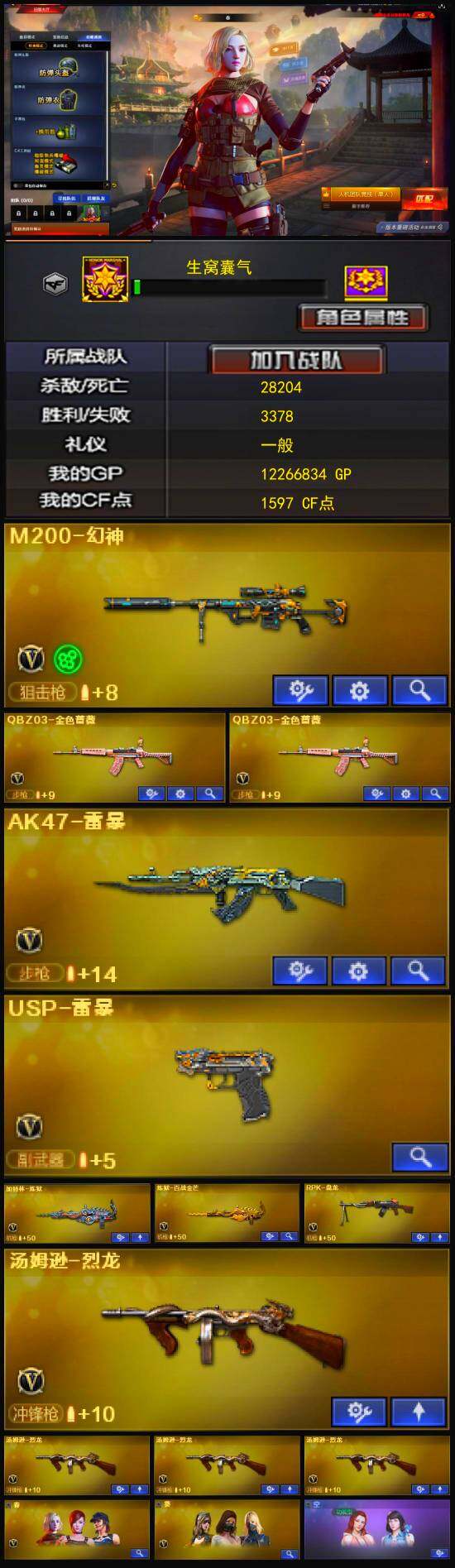 【热门武器】:QBZ03-金色蔷薇*2,M200-幻神,M4A1-黑骑士,汤姆逊-烈龙*4,RPK-盘龙,加特林-炼狱,USP-雷暴,沙鹰-修罗*5