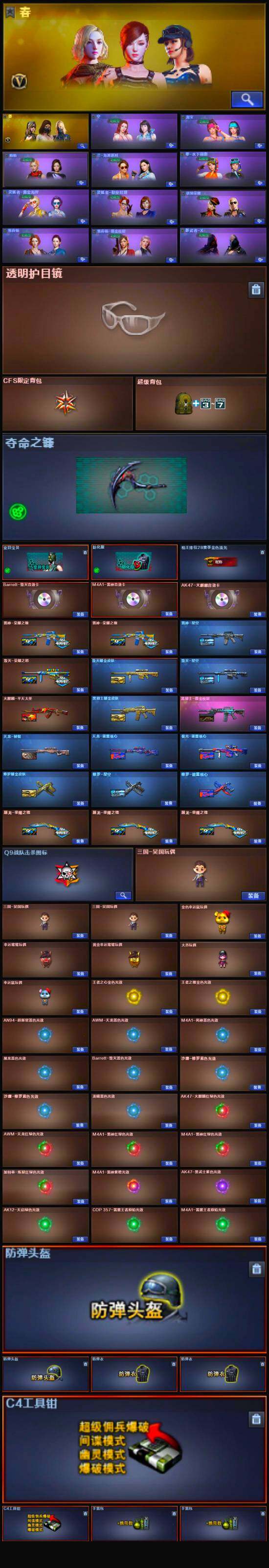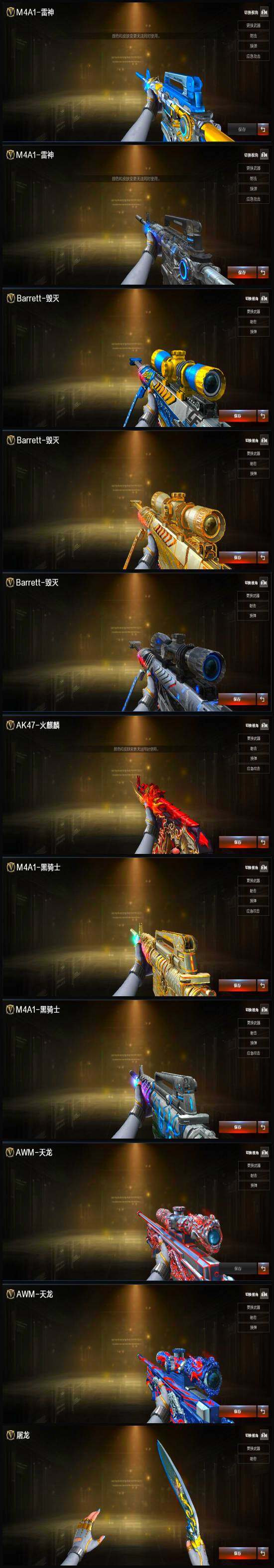 【英雄级武器】:AK47-雷暴,USP-雷暴,斩神刀-雷暴,M4A1-武圣*10,QBZ03-金色蔷薇*2,M4A1-雷神*5,M4A1-黑骑士,M4A1-死神*3,RPK-盘龙,加特林-炼狱,汤姆逊-烈龙*4,AK47-火麒麟*3,AK47-黑武士*11,AK12-天启,AN94-超新星,AWM-天龙*2,Barrett-毁灭*9,Barrett-极光,M200-幻神,AK47-黑鲨*4,M4A1-猎神*2,M4A1-千变*2,黑武士-锦绣游龙,AK-47-猩红传说*2,AK47-B-常胜将军,沙鹰-天神,沙鹰-修罗*5,麒麟刺*2,擎天*2,龙啸*2,屠龙*7
