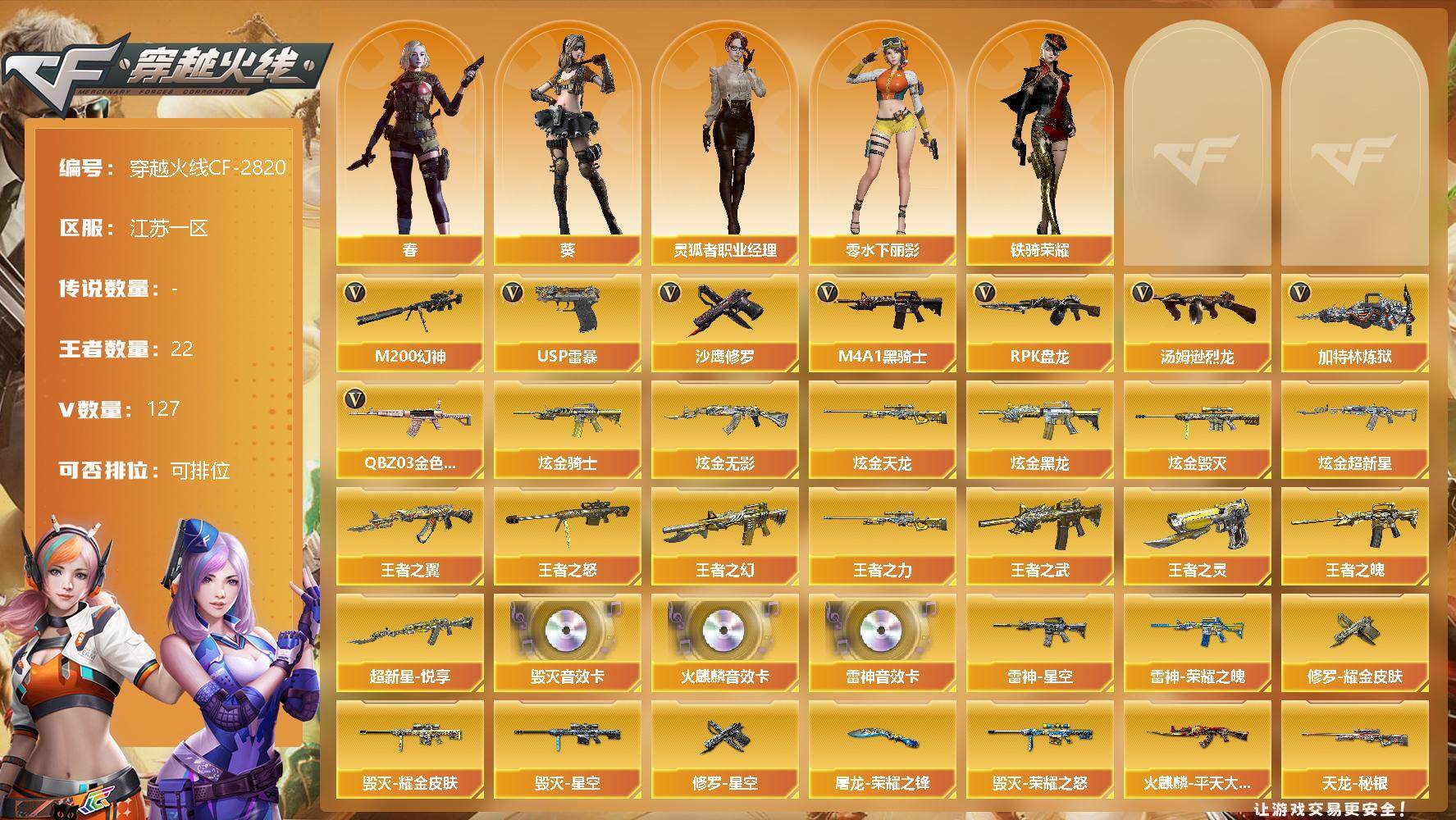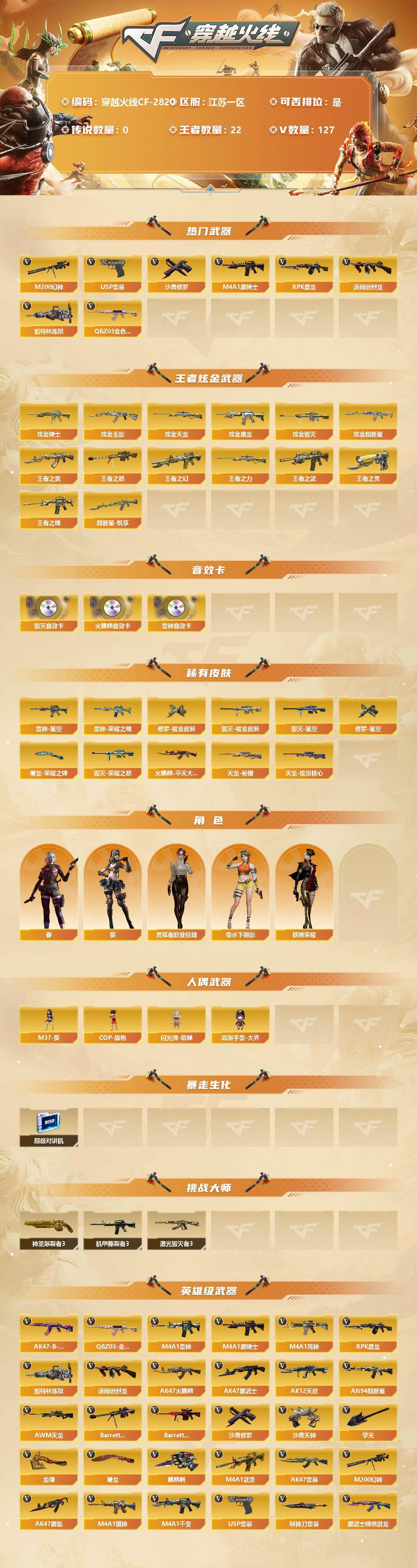 [12494166]【商品标题】:江苏一区-127V-22王者-13炫金 【热门武器】:QBZ03-金色蔷薇*2,M200-幻神,M4A1-黑骑士,汤姆逊-烈龙*4,RPK-盘龙,加特林-炼狱,USP-雷暴,沙鹰-修罗*5 【王者炫金武器】:炫金骑士,炫金无影,炫金天龙*3,炫金黑龙*5,炫金毁灭*2,炫金超新星,超新星-悦享*4,王者之幻,王者之翼*2,王者之武,王者之怒,王者之力*4,王者之魄,王者之灵 【音效卡】:AK47-火麒麟音效卡,M4A1-雷神音效卡,Barrett-毁灭音效卡 【稀有皮肤】:雷神-荣耀之魄*2,雷神-星空,火麒麟-平天大圣,毁灭-荣耀之怒,毁灭耀金皮肤,毁灭-星空,天龙-秘银,天龙-能量核心,修罗耀金皮肤,修罗-星空,屠龙-荣耀之锋*3 【角色】:零-水下丽影,灵狐者-职业经理,葵,春,铁骑荣耀 【人偶武器】:M37-葵,COP-旗袍,闪光弹-貂蝉,高爆手雷-大乔 【暴走生化】:超级对讲机 【挑战大师】:神圣爆裂者III,机甲撕裂者III,激光毁灭者III 【英雄级武器】:AK47-雷暴,USP-雷暴,斩神刀-雷暴,M4A1-武圣*10,QBZ03-金色蔷薇*2,M4A1-雷神*5,M4A1-黑骑士,M4A1-死神*3,RPK-盘龙,加特林-炼狱,汤姆逊-烈龙*4,AK47-火麒麟*3,AK47-黑武士*11,AK12-天启,AN94-超新星,AWM-天龙*2,Barrett-毁灭*9,Barrett-极光,M200-幻神,AK47-黑鲨*4,M4A1-猎神*2,M4A1-千变*2,黑武士-锦绣游龙,AK-47-猩红传说*2,AK47-B-常胜将军,沙鹰-天神,沙鹰-修罗*5,麒麟刺*2,擎天*2,龙啸*2,屠龙*7 【特殊枪械】:1黑骑士,4烈龙,1盘龙,1炼狱