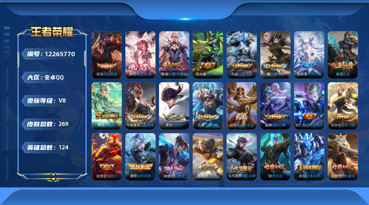 [12265770]V8 1典藏 1无双 16传说 124英雄 269皮肤 可修改实名 优质装备:赤影疾锋,青丘·九尾(妲己无双),黄金射手座,冠军飞将,云鹰飞将(小将军),猫影幻舞,久胜战神,末日机甲-孙尚香(绿蚂蚱),地狱火,超时空战士-狄仁杰,无双飞将,山海·炽霜斩(李信年限),青丘·九尾 珍宝阁皮:妄想食味,优雅恋人,蔷薇恋人 限定皮:鸣野蒿,至尊宝,异界灵契(白毛香),瑞麟志(木兰年限),遇见飞天,高山流水,诗剑行,怒海麟威,五谷丰年,青龙志(铠年限),冰锋战神,武圣,梁祝,龙胆,李小龙,玄武志(苏烈年限),朱雀志(守约年限),孙行者 史诗皮:蒙犽顽岩魄,破空之剑,决胜骁骑,电玩小子(小书包),黄金分割率,特工魅影,魅语,无限星赏官,冰冠公主,百相守梦(关羽),末日机甲-吕布,猫狗日记-孙策,猫狗日记-大乔,时之恋人-孙尚香,乱世虎臣,节奏热浪,修罗,女仆咖啡,摇滚巨星,水果甜心,绅士熊喵,星夜王子,心灵骇客,功夫厨神,德古拉伯爵,暗隐猎兽者,鬼剑武藏,地狱岩魂,纤云弄巧,乘风破浪,逐浪之夏,水晶猎龙者,曙光守护者,箭羽风息,金属风暴,圣诞狂欢,鹰眼统帅,魅力维加斯,无心,未来纪元-赵云