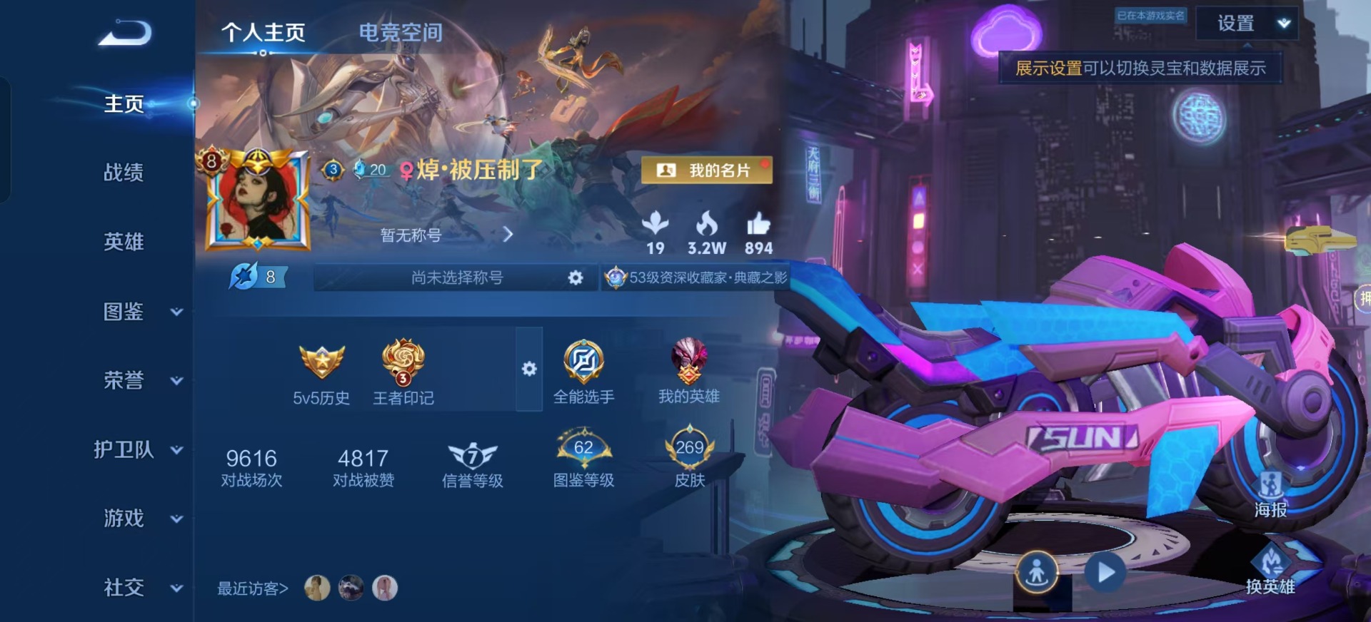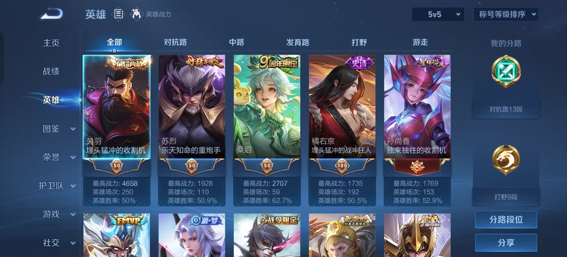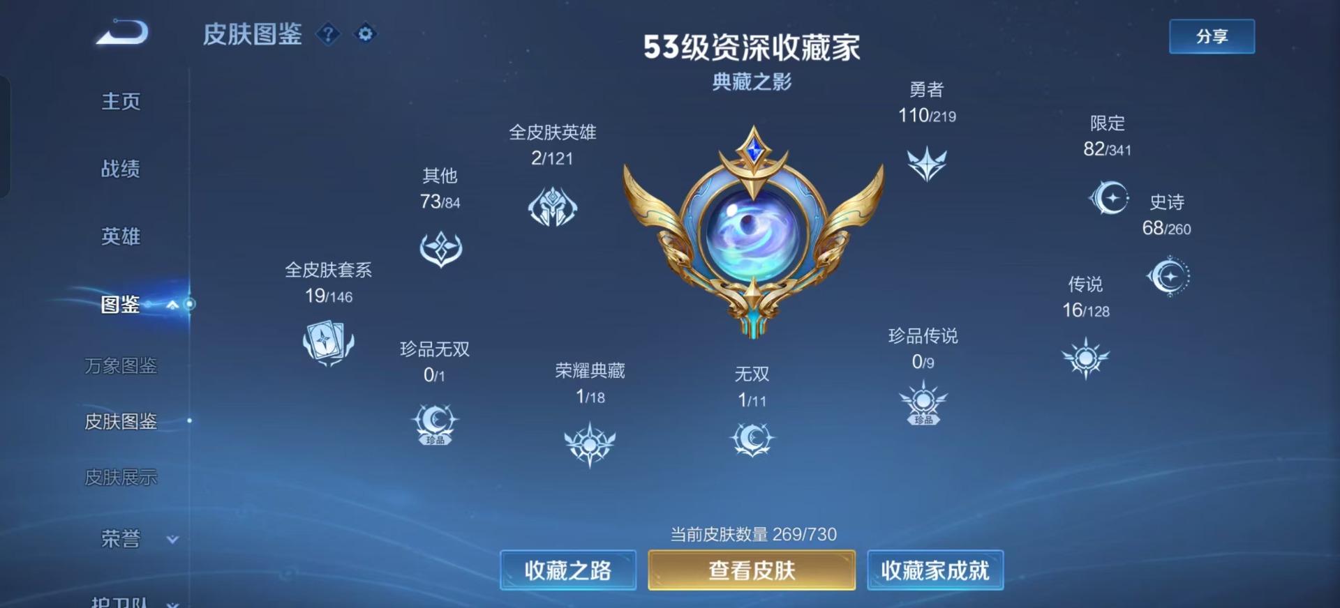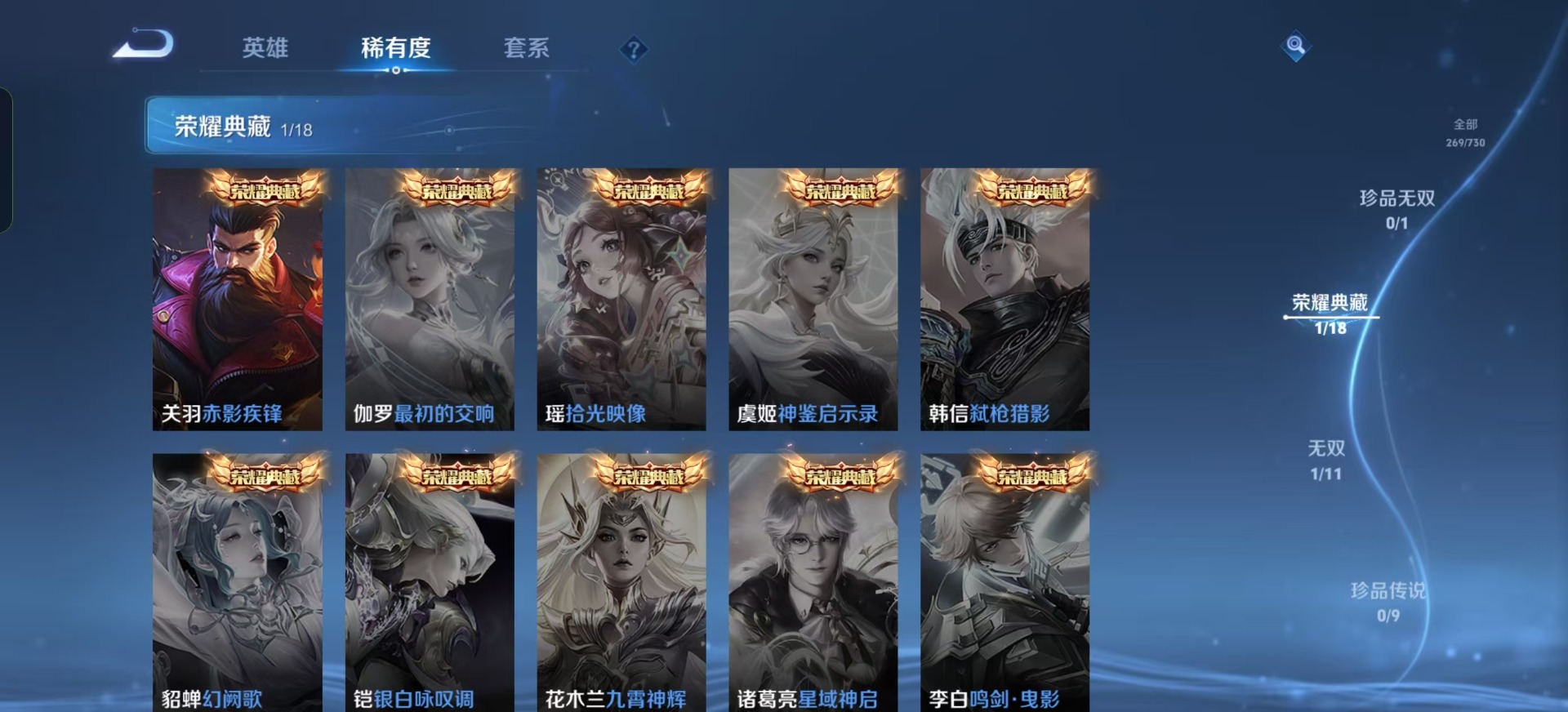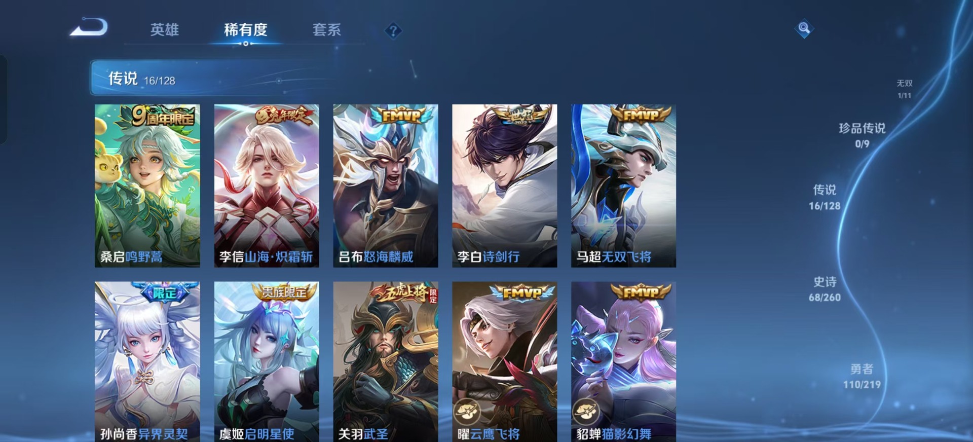 - PX_2095965-贵族等级: V9 英雄数: 124 皮肤数: 265 荣耀水晶: 天鹅之梦,幻阙歌,拾光映像,最初的交响 无双皮: 真我赫兹(瑶),小乔时之魔女 珍品传说: 怪盗基德 星传说: 时之愿境,金色仲夏夜,星际治安官 传说皮: 云鹰飞将,仲夏夜之梦,音你心动-周瑜,乞巧织情,游龙清影,碎云,记忆之芯,妄想奇谈,大乔-时之奇旅,幻光神枪 限定皮: 祈雪灵祝,时之彼端,乒乒小将,孙行者