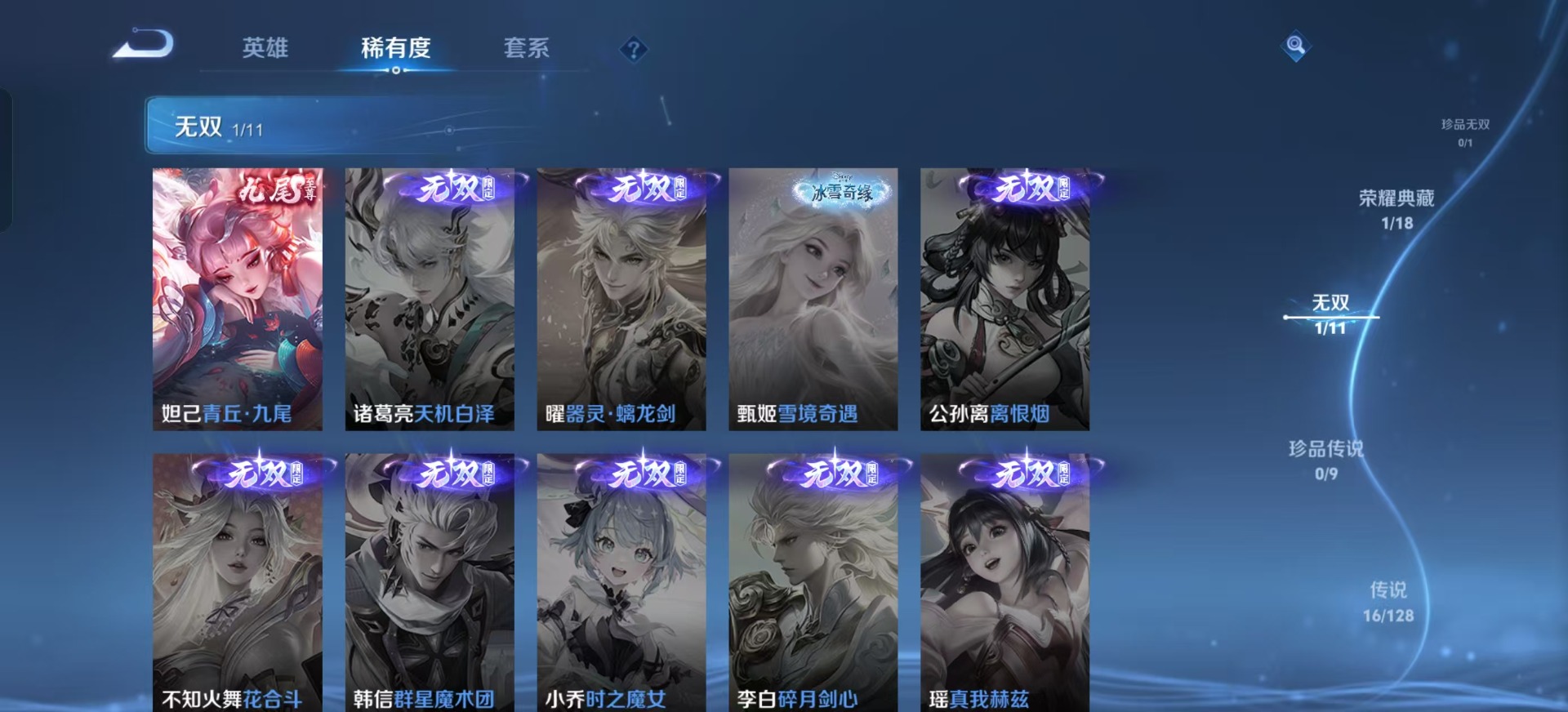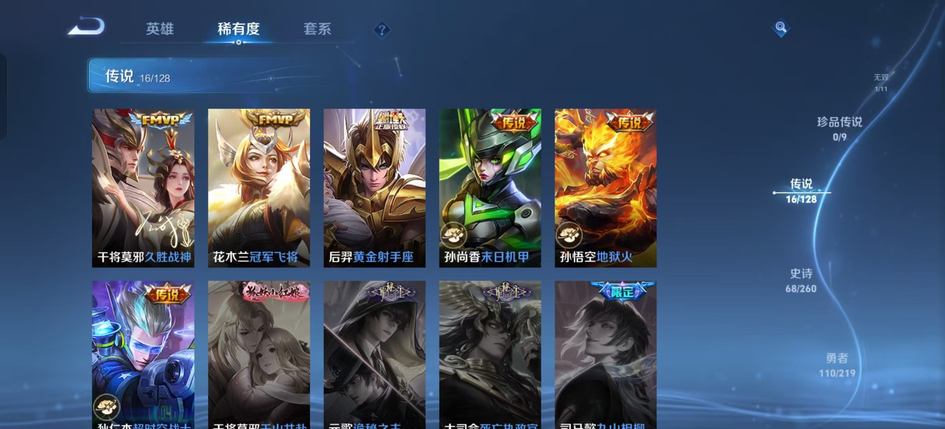 铠青龙志,苏烈玄武志,赵云龙胆,孙尚香异界灵契,裴擒虎李小龙,上官婉儿梁祝,李白诗剑行,花木兰瑞麟志,桑启鸣野蒿,孙悟空孙行者,孙悟空至尊宝,百里守约朱雀志,关羽武圣,关羽冰锋战神