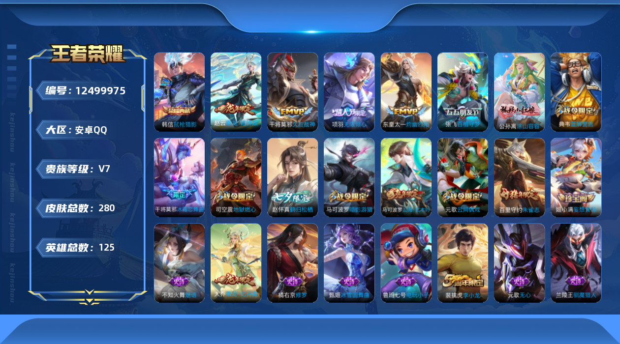 [12499975]【商品标题】:安卓Q-V3-最强王者段位-125英雄-280皮肤-1典藏-0珍品无双-0无双-0珍品传说-5传说-79史诗