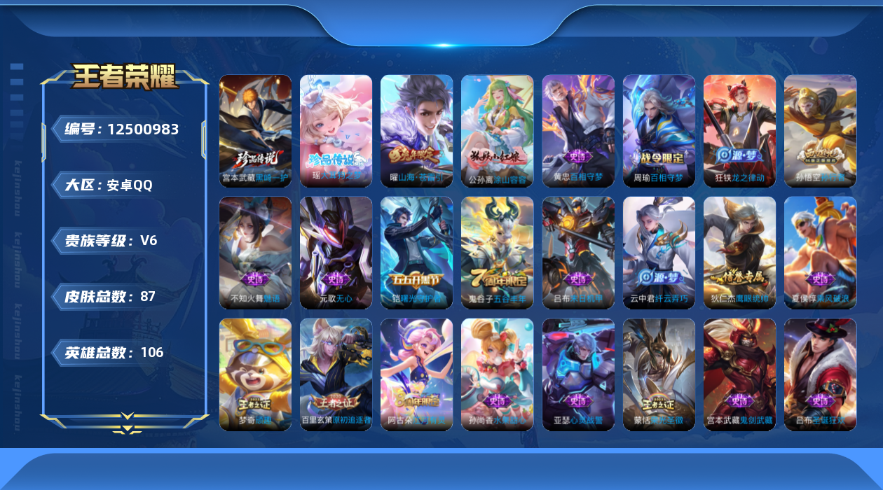 [12500983]【商品标题】:安卓Q-V6-至尊星耀IV段位-106英雄-87皮肤-0典藏-0珍品无双-0无双-2珍品传说-1传说-27史诗