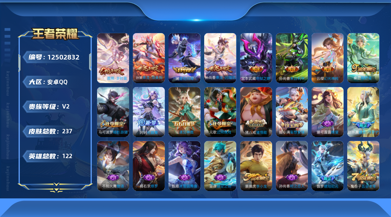 [12502832]【商品标题】:安卓Q-V2-尊贵铂金II段位-122英雄-236皮肤-0典藏-0珍品无双-0无双-0珍品传说-8传说-58史诗