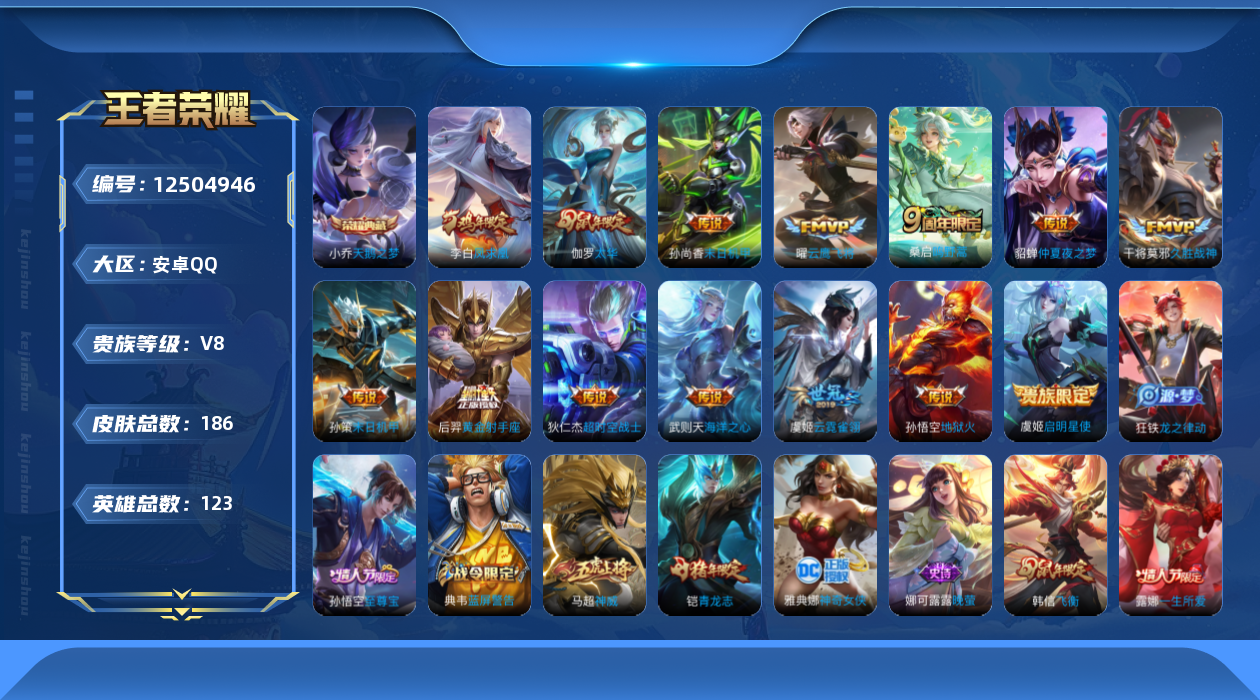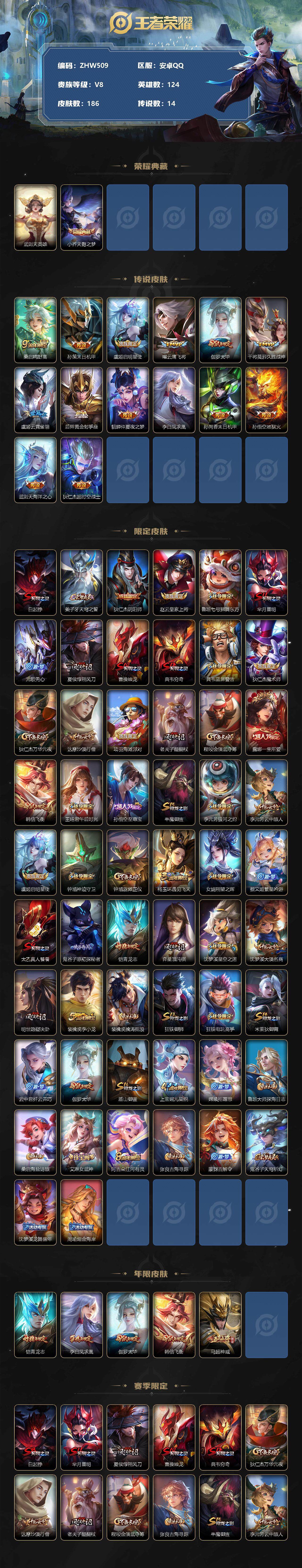 - [12110960]V8 2典藏 2珍品传说 25传说 125英雄 325皮肤 可修改实名 优质装备:鸣剑·曳影,弑枪猎影(韩信典藏),朽木白哉,黑崎一护,黄金狮子座,黄金射手座,云鹰飞将(小将军),绛天战甲(鸡嘴战神),炽阳神光,一念神魔,末日机甲-孙尚香(绿蚂蚱),地狱火,地狱之眼,末日机甲-孙策,无双飞将,燃星之曲,电玩·雷克斯,澜逐花归海,诡秘之主,千山共赴,涂山容容 传说皮:死亡执政官,九山相柳,祥瑞亨通 珍宝阁皮:优雅恋人,蔷薇恋人 限定皮:鸣野蒿,至尊宝,凤求凰(白切鸡),时雨天司(水龙头),飞衡(韩信年限),遇见飞天,诗剑行,五谷丰年,冰锋战神,游园惊梦,梁祝,祈雪灵祝(雪兔子),李小龙,逐梦之影,霸王别姬-虞姬,默契交锋-花木兰,大圣娶亲,引擎之心,冰霜恋舞曲,美猴王 史诗皮:飞车小橘子,灵蛊蚀心,龙之律动,东方月初,百相守梦-黄忠,紫霞仙子,电玩小子(小书包),白龙吟,黄金分割率,特工魅影,千年之狐,江河有灵,鹤归松栖(赵怀真),蒙恬荣光圣徽,匿光破解者,冰冠公主,偶像歌手,电玩·兔顽号,电玩·爆裂旋风,暗夜猫娘,百相守梦(关羽),龙骑士(小龙虾),末日机甲-吕布,节奏热浪,女仆咖啡,摇滚巨星,水果甜心,天才门将,星夜王子,功夫厨神,德古拉伯爵,暗隐猎兽者,幽灵船长,鬼剑武藏,地狱岩魂,繁星吟游(呼啦呼啦),缤纷独角兽,乘风破浪,逐浪之夏,水晶猎龙者,箭羽风息,金属风暴,原初追逐者,圣诞狂欢,鹰眼统帅,王者之锤,暗夜贵公子,魅力维加斯,黎明之约,赏金猎手,未来纪元-赵云,玫瑰异探