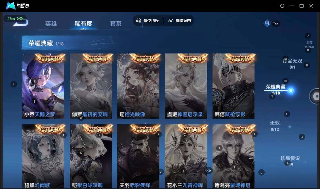 【史诗皮肤】:阿轲暗夜猫娘,赵云皇家上将,王昭君偶像歌手,狄仁杰魔术师,廉颇地狱岩魂,宫本武藏鬼剑武藏,孙尚香水果甜心,妲己女仆咖啡,吕布末日机甲,张飞乱世虎臣,孙悟空至尊宝,花木兰水晶猎龙者,夏侯惇乘风破浪,小乔缤纷独角兽,兰陵王暗隐猎兽者,诸葛亮黄金分割率,亚瑟心灵战警,雅典娜冰