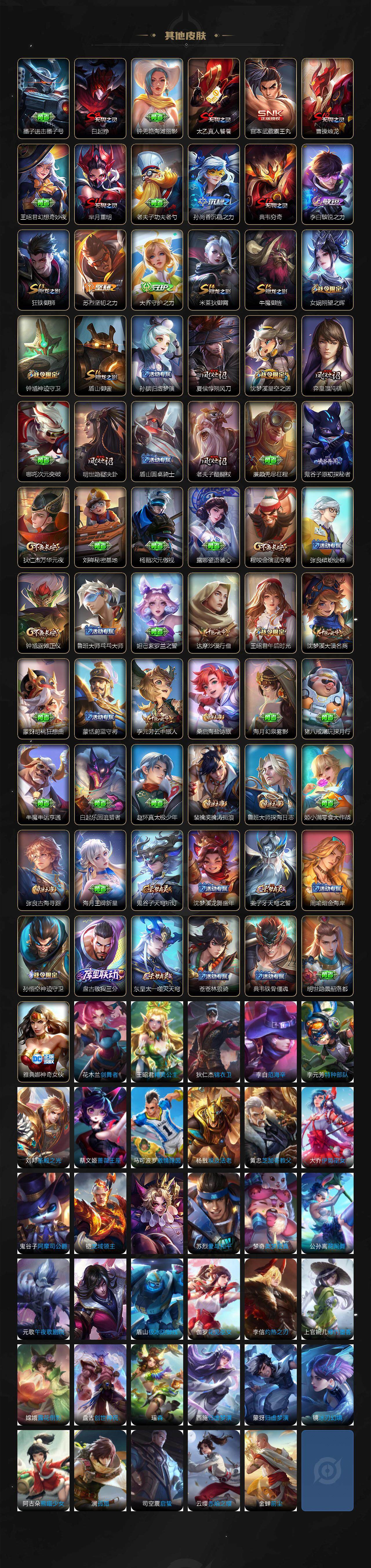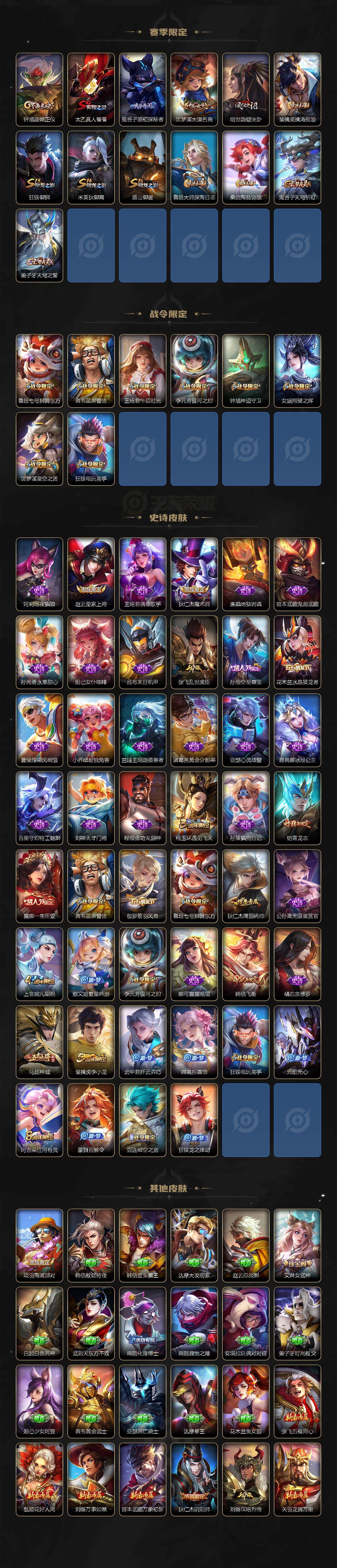 【限定皮肤】:白起狰,姜子牙天穹之誓,狄仁杰阴阳师,赵云皇家上将,鲁班七号狮舞东方,芈月重明,元歌无心,夏侯惇朔风刀,曹操烛龙,典韦穷奇,典韦蓝屏警告,狄仁杰魔术师,狄仁杰万华元夜,达摩沙漠行僧,项羽海滩派对,老夫子醍醐杖,程咬金演武夺筹,露娜一生所爱,韩信飞衡,王昭君午后时光,孙悟空至尊宝,牛魔御旌,李元芳银河之约,李元芳云中旅人,虞姬启明星使,钟馗神迹守卫,钟馗驱傩正仪,杨玉环遇见飞天,女娲朔望之晖,蔡文姬繁星吟游,太乙真人饕餮,鬼谷子原初探秘者,铠青龙志,弈星混沌棋,沈梦溪星空之诺,沈梦溪大漠名商,明世隐疑决卦,裴擒虎李小龙,裴擒虎擒涛扼浪,狂铁御狮,狂铁电玩高手,米莱狄御霄,云中君纤云弄巧,伽罗太华,盾山御銮,上官婉儿梁祝,嫦娥拒霜思,鲁班大师探海日志,桑启海盐诗旅,艾琳女武神,阿古朵江河有灵,张良古海寻踪,蒙犽百解令,鬼谷子天穹祈灯,沈梦溪龙舞盛年,周瑜熔金海岸