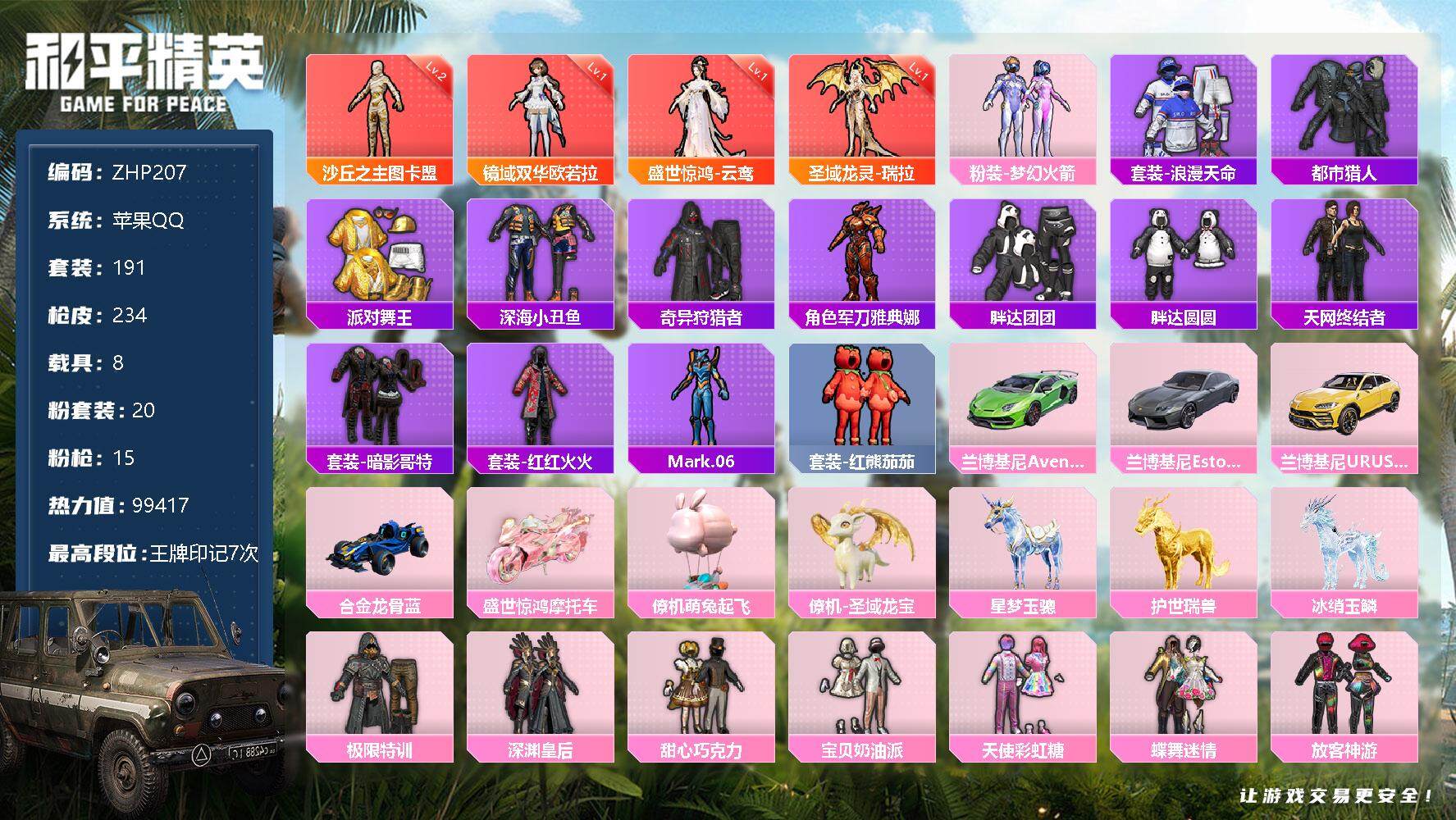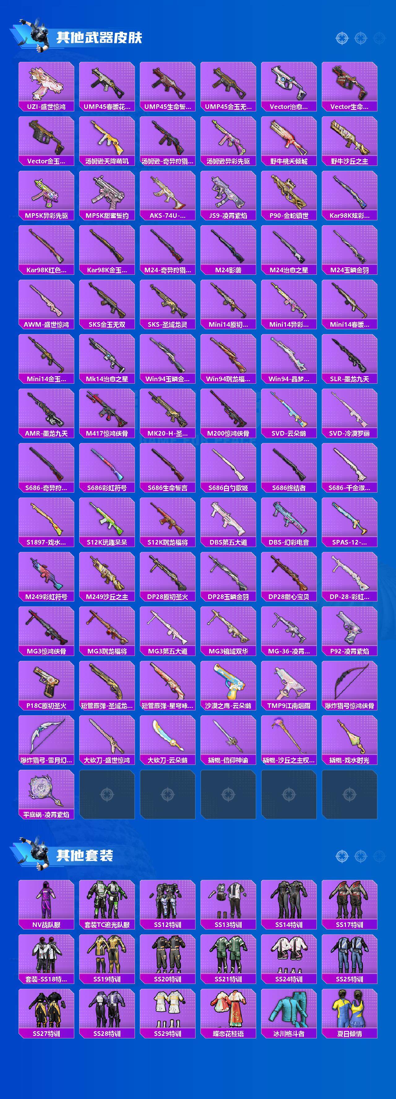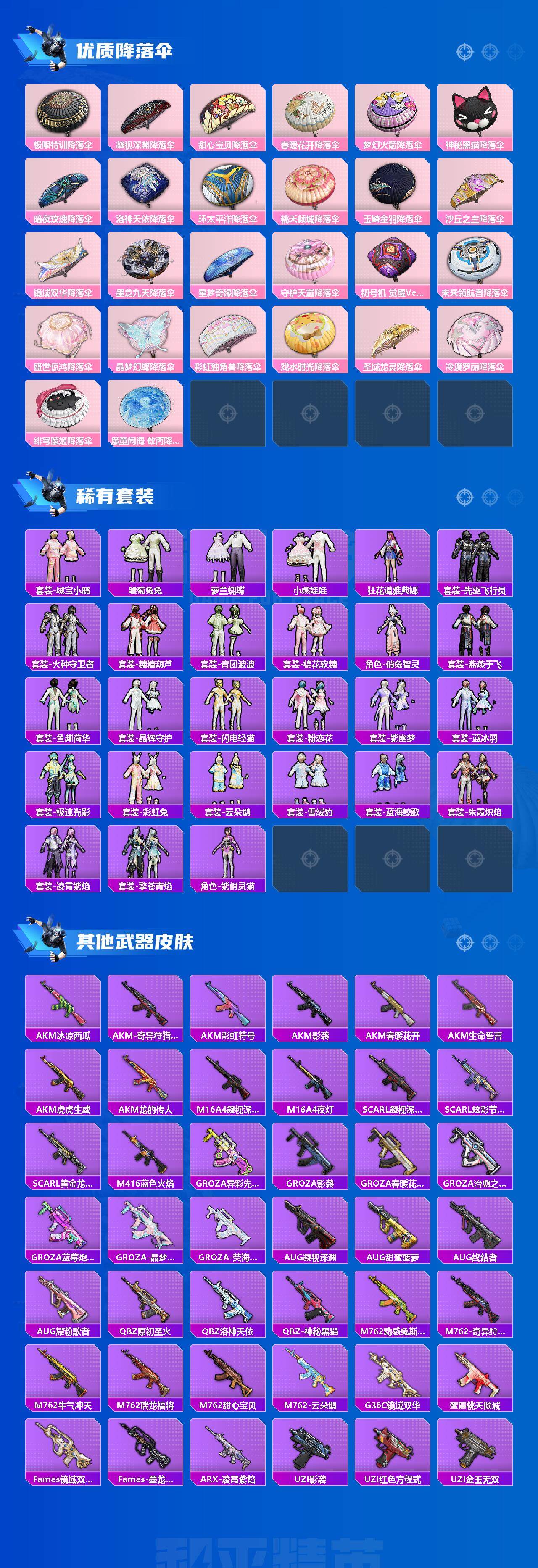 - [12234024]30粉装 9特效枪 3载具 12印记 可二次 可修改实名 身法装备:暗影哥特(红眼罩) 优质装备:晶梦灵驹,海龙奔腾,路特斯ELETRE(冰川蓝),MG3洛神天依,宝贝奶油派,粉色回忆,甜蜜誓约,炙焰红王,馨动时刻,SLR暗夜玫瑰,UMP45恐龙拽拽,七级UMP45-恐龙拽拽,七级MG3-洛神天依,GROZA-镜光银凌,SVD-月影灵韵,七级SVD-月影灵韵,萨利娅,晶梦幻蝶,MK14-樱桃泡泡,羊梦糖心,Kar98K-巳巳如意 热门装扮:彩虹鹿灵,山涧鹿灵,黑伞漫漫,酣梦娃娃,碧影闪光,海渊国主,紫电风暴,赤焰黑爵,闪耀律动,橘柚倾心,霞光圣骑,寒光使者,傲雪凌霜,霁雪冰心,旋转彩虹,冰川红玫,冰川幽秘,音爆索尼克,呆萌星弥,小可学妹,闲梦青缨,美雪,兔兔白日梦,神秘黑猫,胖达圆圆,奶芙汪汪,激萌罗小黑,恶魔喵喵,爱崽白熊,浪漫波比 载具:僚机-萌兔起飞 稀有枪皮:DP-28-豹影疾电 五级特效枪:五级GROZA-镜光银凌,五级Kar98K-巳巳如意,五级DP-28-豹影疾电 四级特效枪:四级MK14-樱桃泡泡 二级特效枪:二级SLR-暗夜玫瑰 紫色装扮:幻彩翩翩,SS23特训,妙红点点,SS30特训套装,SS31特训套装,SS33特训套装,旭日情侣,SS21特训,熠彩粉晶,紫芒星,岑岑玉浪,星夜迷魅,琉璃情波,田园牧歌,轻风白浪,和煦暖阳,SS22特训,香榭午后,顶瓜瓜,冷焰舞者,北国孤狼,千禧之恋,吉莉礼服,夏日音浪,完美偶像,帅气教官,幻世战舞者,幻影武者,萌趣咩咩,军械专家,灵幻魔术师,娇憨猪猪,海龙战士,冰爽风暴,爆裂葡萄,瑞龙福将,团圆交子,SS17特训,SS14特训,萌趣颜团子,特种颜团子,星河入梦,SS15特训,极乐追光,浓情摩卡,SS20特训,醇脆可可,香草威化,浑天鲲鹏,甜心亚梦,虚音幻奏,猎梦纪元,粉团憨憨,梦幻奶油,酸甜橘柚,奶油香芋,樱桃黑巧,怒火燎原,夏雨游龙,软羊咩咩,魔力冰咖,沁蓝冰爽,冰川谧蓝,焰山流火,绿翡凌光,月蓝流光,异彩先驱,缤纷焰火,SS18特训,水晶王族,雪兔飞飞,茉莉之诺,风铃甜诗,飞驰魅影,音速流光,SS19特训,圣诞惊喜,沙暴悍客,青年教官,风暴特警,飞行日记,骑行爱好者,魅力单车,鹤鸣,麻辣教官,黄色运动,黑色伏地魔,龙的传人,冰河战士,龙魂突击队,蝶变,香桃花海,霓虹街区,酷潮明星,都市魅力,霓虹极客,野性