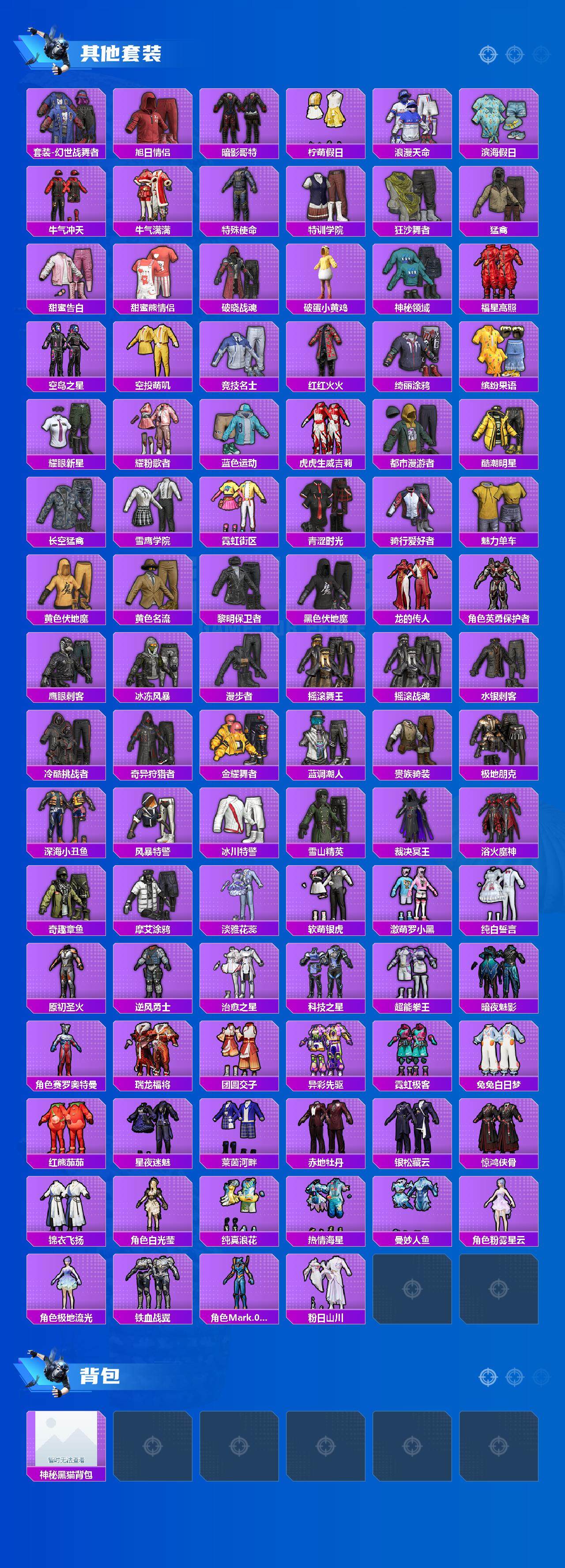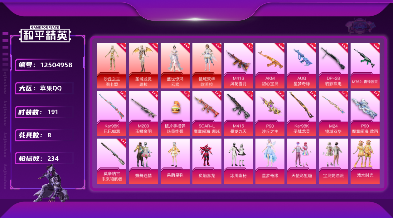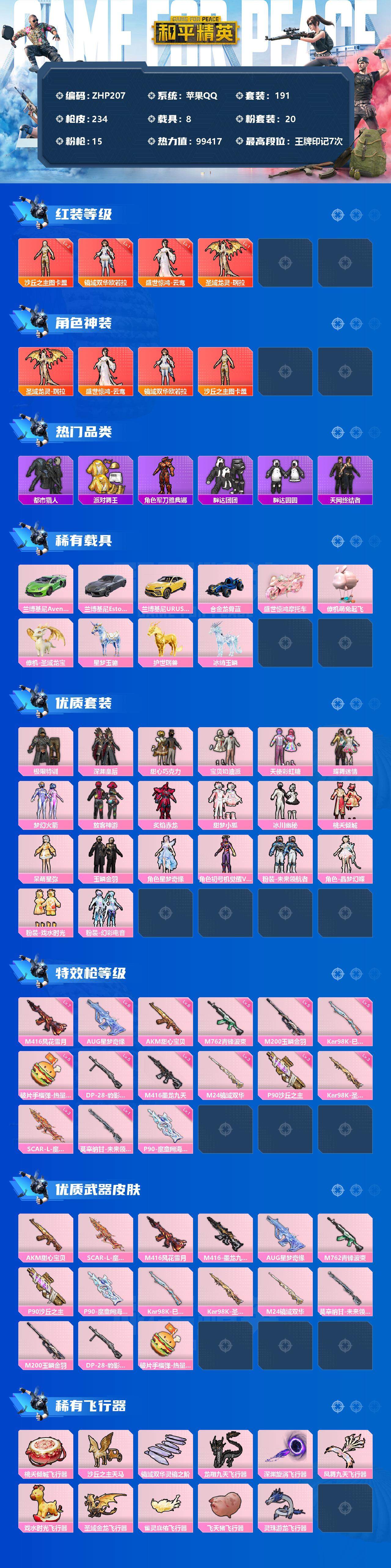 - [12234024]30粉装 9特效枪 3载具 12印记 可二次 可修改实名 身法装备:暗影哥特(红眼罩) 优质装备:晶梦灵驹,海龙奔腾,路特斯ELETRE(冰川蓝),MG3洛神天依,宝贝奶油派,粉色回忆,甜蜜誓约,炙焰红王,馨动时刻,SLR暗夜玫瑰,UMP45恐龙拽拽,七级UMP45-恐龙拽拽,七级MG3-洛神天依,GROZA-镜光银凌,SVD-月影灵韵,七级SVD-月影灵韵,萨利娅,晶梦幻蝶,MK14-樱桃泡泡,羊梦糖心,Kar98K-巳巳如意 热门装扮:彩虹鹿灵,山涧鹿灵,黑伞漫漫,酣梦娃娃,碧影闪光,海渊国主,紫电风暴,赤焰黑爵,闪耀律动,橘柚倾心,霞光圣骑,寒光使者,傲雪凌霜,霁雪冰心,旋转彩虹,冰川红玫,冰川幽秘,音爆索尼克,呆萌星弥,小可学妹,闲梦青缨,美雪,兔兔白日梦,神秘黑猫,胖达圆圆,奶芙汪汪,激萌罗小黑,恶魔喵喵,爱崽白熊,浪漫波比 载具:僚机-萌兔起飞 稀有枪皮:DP-28-豹影疾电 五级特效枪:五级GROZA-镜光银凌,五级Kar98K-巳巳如意,五级DP-28-豹影疾电 四级特效枪:四级MK14-樱桃泡泡 二级特效枪:二级SLR-暗夜玫瑰 紫色装扮:幻彩翩翩,SS23特训,妙红点点,SS30特训套装,SS31特训套装,SS33特训套装,旭日情侣,SS21特训,熠彩粉晶,紫芒星,岑岑玉浪,星夜迷魅,琉璃情波,田园牧歌,轻风白浪,和煦暖阳,SS22特训,香榭午后,顶瓜瓜,冷焰舞者,北国孤狼,千禧之恋,吉莉礼服,夏日音浪,完美偶像,帅气教官,幻世战舞者,幻影武者,萌趣咩咩,军械专家,灵幻魔术师,娇憨猪猪,海龙战士,冰爽风暴,爆裂葡萄,瑞龙福将,团圆交子,SS17特训,SS14特训,萌趣颜团子,特种颜团子,星河入梦,SS15特训,极乐追光,浓情摩卡,SS20特训,醇脆可可,香草威化,浑天鲲鹏,甜心亚梦,虚音幻奏,猎梦纪元,粉团憨憨,梦幻奶油,酸甜橘柚,奶油香芋,樱桃黑巧,怒火燎原,夏雨游龙,软羊咩咩,魔力冰咖,沁蓝冰爽,冰川谧蓝,焰山流火,绿翡凌光,月蓝流光,异彩先驱,缤纷焰火,SS18特训,水晶王族,雪兔飞飞,茉莉之诺,风铃甜诗,飞驰魅影,音速流光,SS19特训,圣诞惊喜,沙暴悍客,青年教官,风暴特警,飞行日记,骑行爱好者,魅力单车,鹤鸣,麻辣教官,黄色运动,黑色伏地魔,龙的传人,冰河战士,龙魂突击队,蝶变,香桃花海,霓虹街区,酷潮明星,都市魅力,霓虹极客,野性