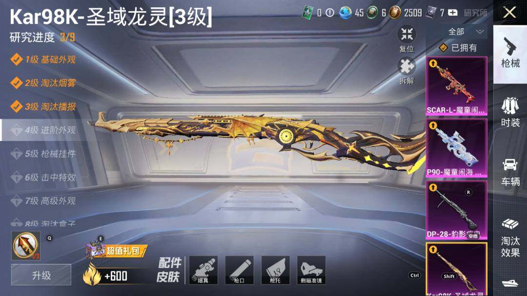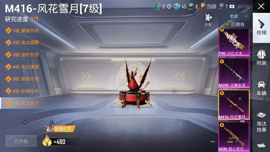 【粉色枪皮等级】:AKM-甜心宝贝(六级),SCAR-L-魔童闹海 哪吒(三级),M416-风花雪月(七级),M416-墨龙九天(三级),AUG-星梦奇缘(六级),M762-青锋波束(五级),P90-沙丘之主(三级),P90-魔童闹海 敖丙(一级),Kar98K-巳巳如意(五级),Kar98K-圣域龙灵(三级),M24-镜域双华(三级),莫辛纳甘-未来领航者(一级),M200-玉鳞金羽(五级),DP-28-豹影疾电(五级),破片手榴弹-热量炸弹(五级)