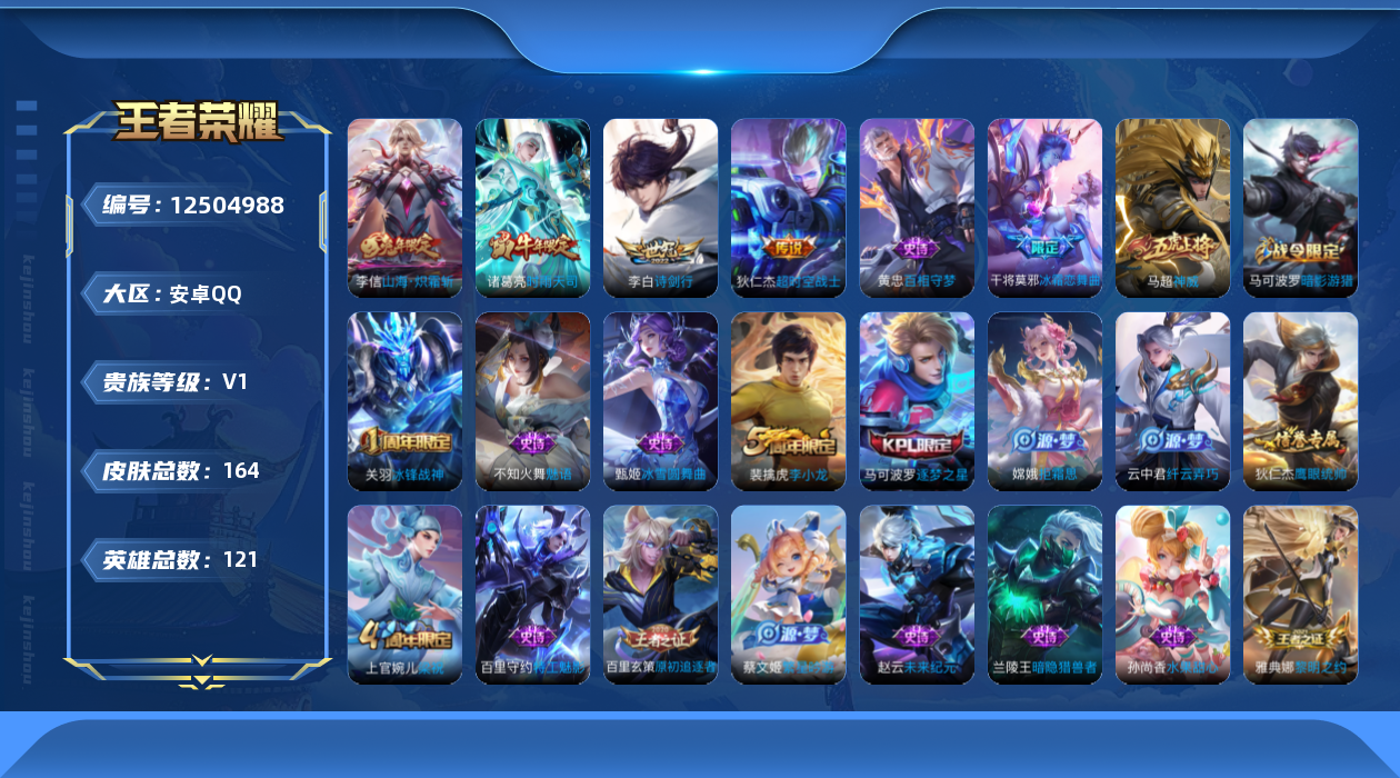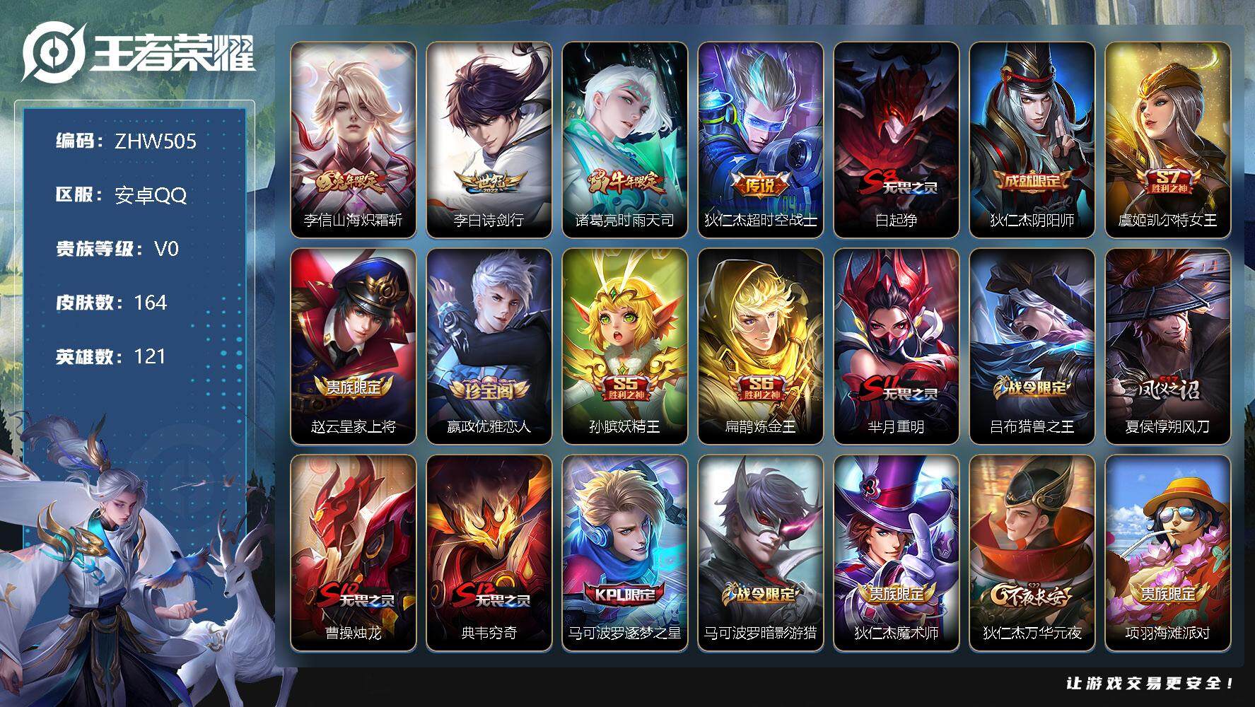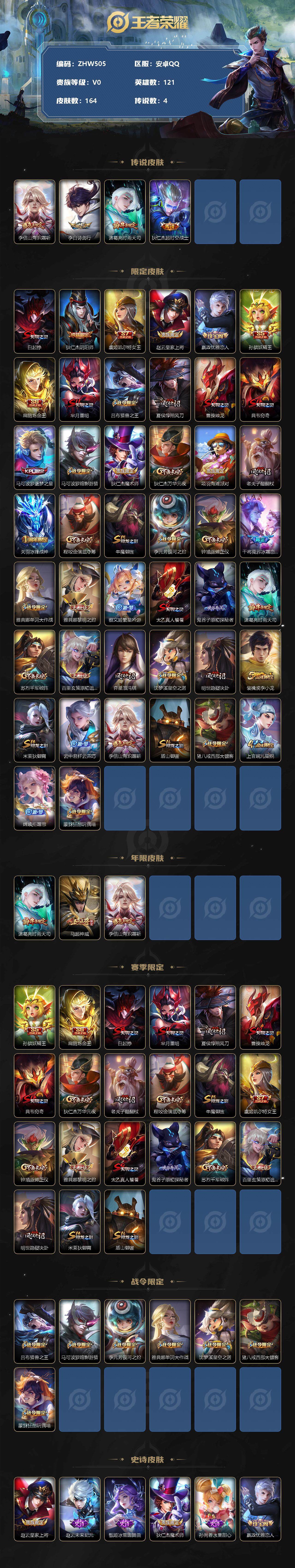 [12504988]【特价急出/详情看图】:安卓Q-V0-永恒钻石I段位-121英雄-164皮肤-4传说-31史诗