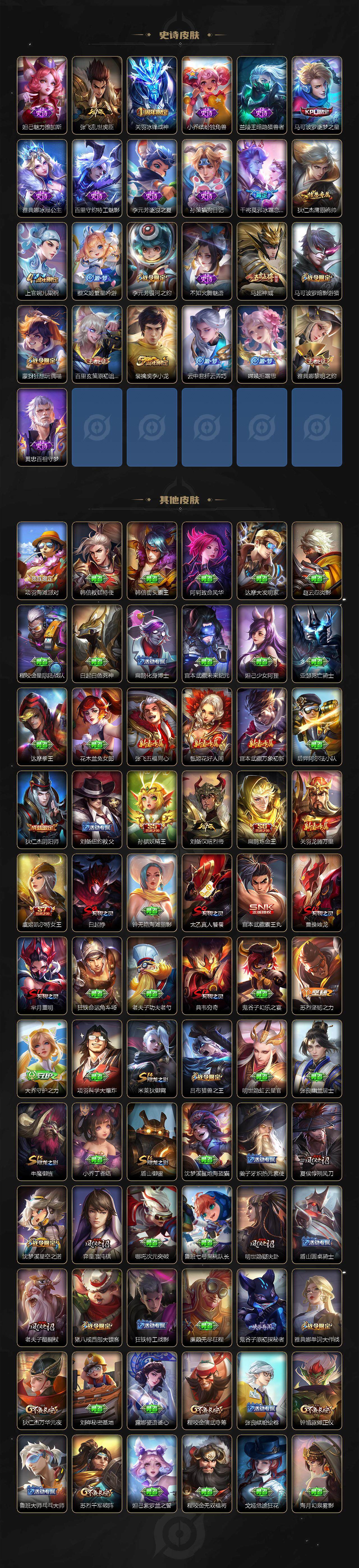 【史诗皮肤】:赵云皇家上将,赵云未来纪元,甄姬冰雪圆舞曲,狄仁杰魔术师,孙尚香水果甜心,嬴政优雅恋人,妲己魅力维加斯,张飞乱世虎臣,关羽冰锋战神,小乔缤纷独角兽,兰陵王暗隐猎兽者,马可波罗逐梦之星,雅典娜冰冠公主,百里守约特工魅影,李元芳逐浪之夏,孙策猫狗日记,干将莫邪冰霜恋舞曲,狄仁杰鹰眼统帅,上官婉儿梁祝,蔡文姬繁星吟游,李元芳银河之约,不知火舞魅语,马超神威,马可波罗暗影游猎,蒙犽狂想玩偶喵,百里玄策原初追逐者,裴擒虎李小龙,云中君纤云弄巧,嫦娥拒霜思,雅典娜黎明之约,黄忠百相守梦