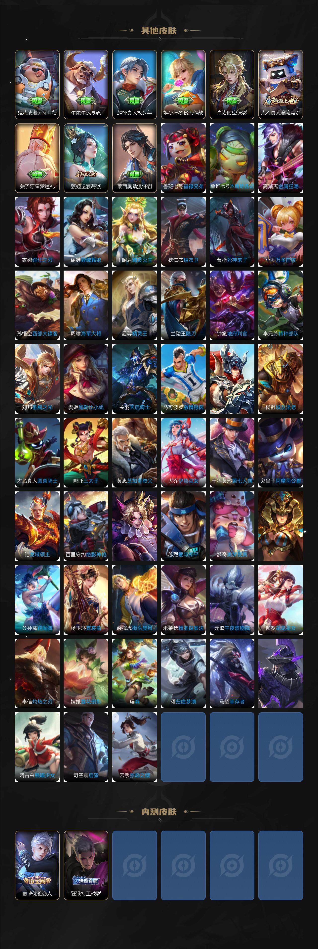 【限定皮肤】:白起狰,狄仁杰阴阳师,虞姬凯尔特女王,赵云皇家上将,嬴政优雅恋人,孙膑妖精王,扁鹊炼金王,芈月重明,吕布猎兽之王,夏侯惇朔风刀,曹操烛龙,典韦穷奇,马可波罗逐梦之星,马可波罗暗影游猎,狄仁杰魔术师,狄仁杰万华元夜,项羽海滩派对,老夫子醍醐杖,关羽冰锋战神,程咬金演武夺筹,牛魔御旌,李元芳银河之约,钟馗驱傩正仪,干将莫邪冰霜恋舞曲,雅典娜单词大作战,雅典娜黎明之约,蔡文姬繁星吟游,太乙真人饕餮,鬼谷子原初探秘者,诸葛亮时雨天司,苏烈千军破阵,百里玄策原初追逐者,弈星混沌棋,沈梦溪星空之诺,明世隐疑决卦,裴擒虎李小龙,米莱狄御霄,云中君纤云弄巧,李信山海炽霜斩,盾山御銮,猪八戒西部大镖客,上官婉儿梁祝,嫦娥拒霜思,蒙犽狂想玩偶喵