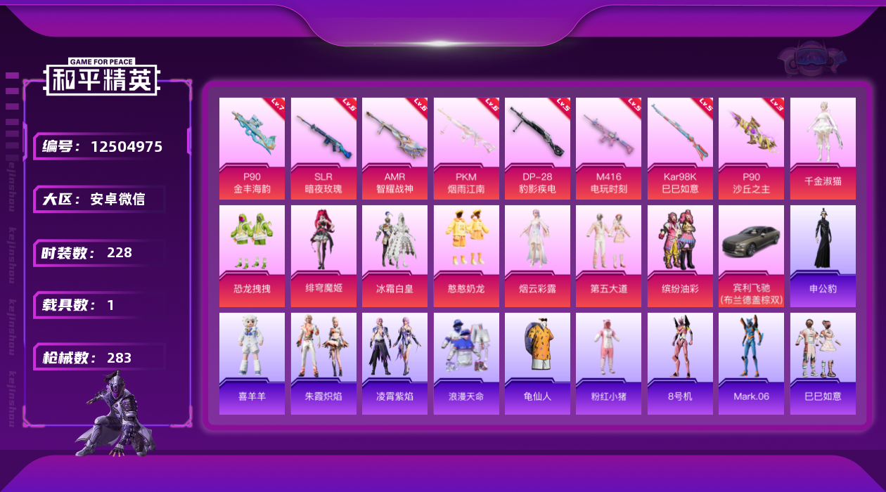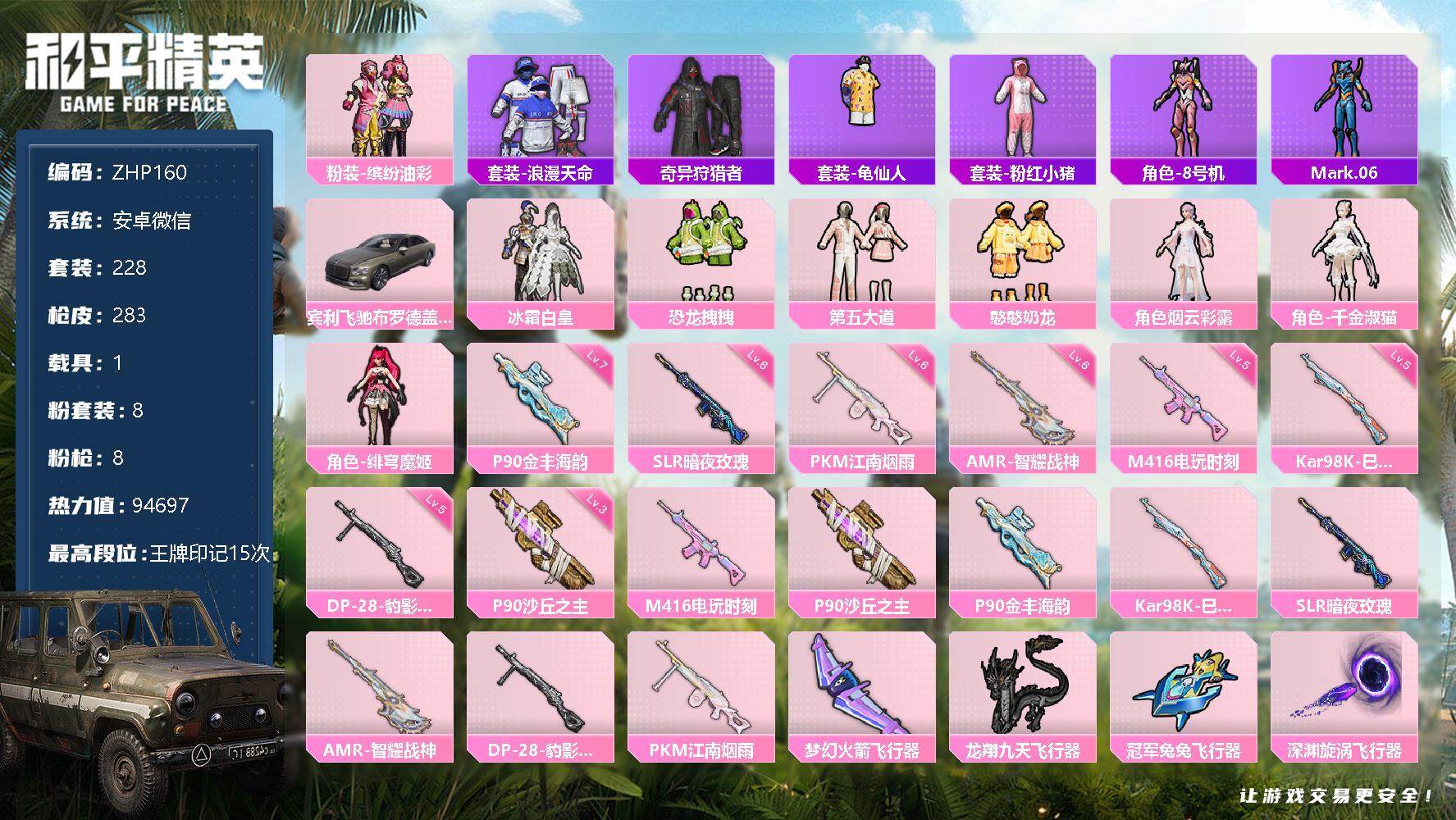 [12504975]【商品标题】:特价急出!安卓 微信-8粉装-8特效枪-1载具-5粉色飞行器-94697热力值-15王牌印记-228套装-283枪皮