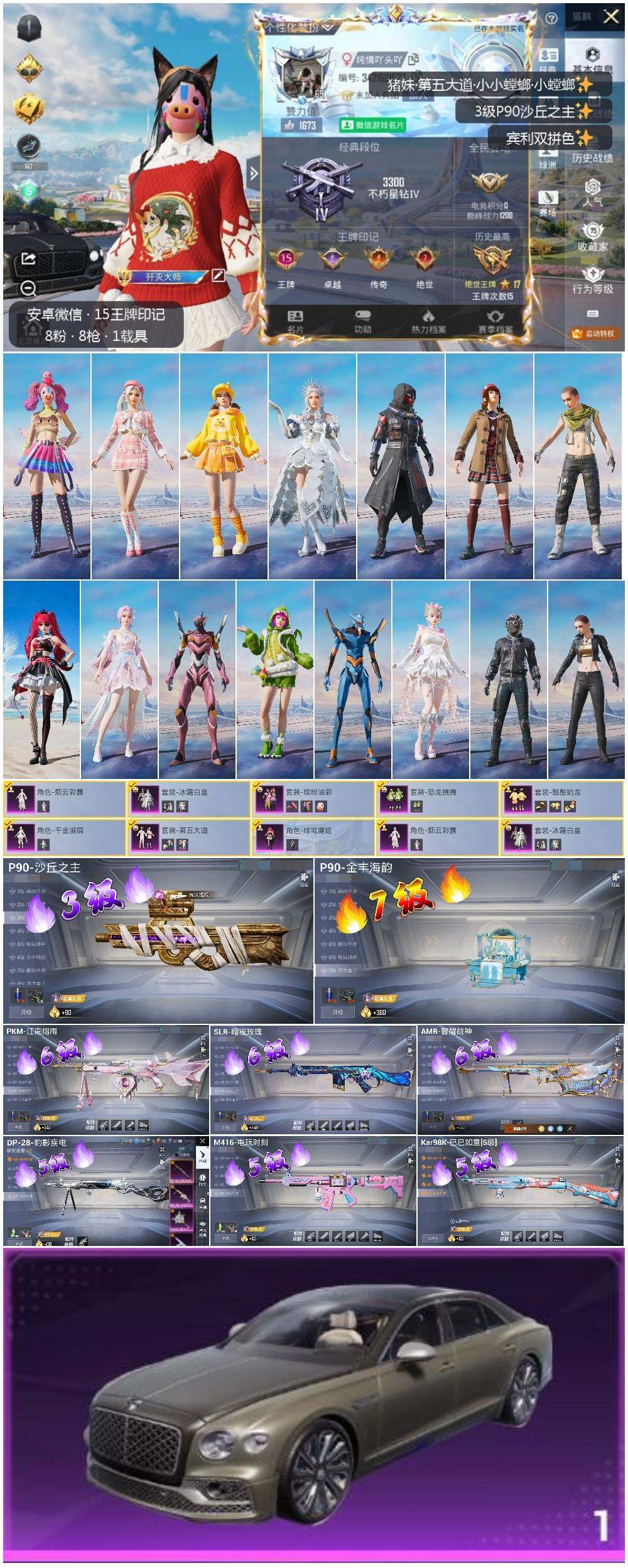 [12504975]【商品标题】:特价急出!安卓 微信-8粉装-8特效枪-1载具-5粉色飞行器-94697热力值-15王牌印记-228套装-283枪皮 【热门品类】:粉装-缤纷油彩,套装-浪漫天命,套装-奇异狩猎者,套装-龟仙人,套装-粉红小猪,角色-8号机,角色-Mark.06 【粉色载具】:宾利飞驰(布罗德盖棕双色) 【粉色套装】:粉装-缤纷油彩,粉装-冰霜白皇,粉装-恐龙拽拽,粉装-第五大道,粉装-憨憨奶龙,角色-烟云彩露,角色-千金淑猫,角色-绯穹魔姬 【粉色枪皮等级】:M416-电玩时刻(五级),P90-沙丘之主(三级),P90-金丰海韵(七级),Kar98K-巳巳如意(五级),SLR-暗夜玫瑰(六级),AMR-智耀战神(六级),DP-28-豹影疾电(五级),PKM-江南烟雨(六级) 【粉色枪皮】:M416-电玩时刻,P90-沙丘之主,P90-金丰海韵,Kar98K-巳巳如意,SLR-暗夜玫瑰,AMR-智耀战神,DP-28-豹影疾电,PKM-江南烟雨 【粉色飞行器】:梦幻火箭飞行器,龙翔九天飞行器,冠军兔兔飞行器,深渊漩涡飞行器,万象金身飞行器 【粉色降落伞】:春暖花开降落伞,风花雪月降落伞,妙趣可丽降落伞,环太平洋降落伞,垂柳戏鸭降落伞,彩虹甜喵降落伞,千面幻镜降落伞,江南烟雨降落伞,精灵梦叶罗丽降落伞,墨龙九天降落伞,创世·救赎降落伞,英伦信使降落伞,千金淑猫降落伞,盛世惊鸿降落伞,幻彩电音降落伞 【稀有套装】:套装-龟仙人,套装-巳巳如意,套装-雏菊兔兔,套装-萝兰蝴蝶,套装-小熊娃娃,套装-糖糖葫芦,套装-青团波波,套装-棉花软糖,角色-都市丽猫,角色-摩登魅猫,套装-燕燕于飞,套装-鱼渊荷华,角色-糖霜甜心,套装-粉恋花,套装-紫幽梦,套装-蓝冰羽,角色-绛羽幽主,套装-朱霞炽焰,套装-凌霄紫焰,玩偶服-喜羊羊,角色-申公豹 【稀有枪皮】:AKM-夜灯,AKM-彩虹符号,AKM-影袭,AKM-江南烟雨,AKM-环太平洋,AKM-生命誓言,AKM-破晓战魂,AKM-萌趣颜团子,AKM-虎虎生威,AKM-霓虹街区,M16A4-幻世战舞者,M16A4-甜心亚梦,M16A4-莲影清波,M16A4-蓝色火焰,SCAR-L-炫彩节奏,SCAR-L-玉兔迎春,SCAR-L-红色方程式,SCAR-L-黄金龙骨,M416-夜灯,M416-糯团青竹,M416-红色方程式,M416-绿