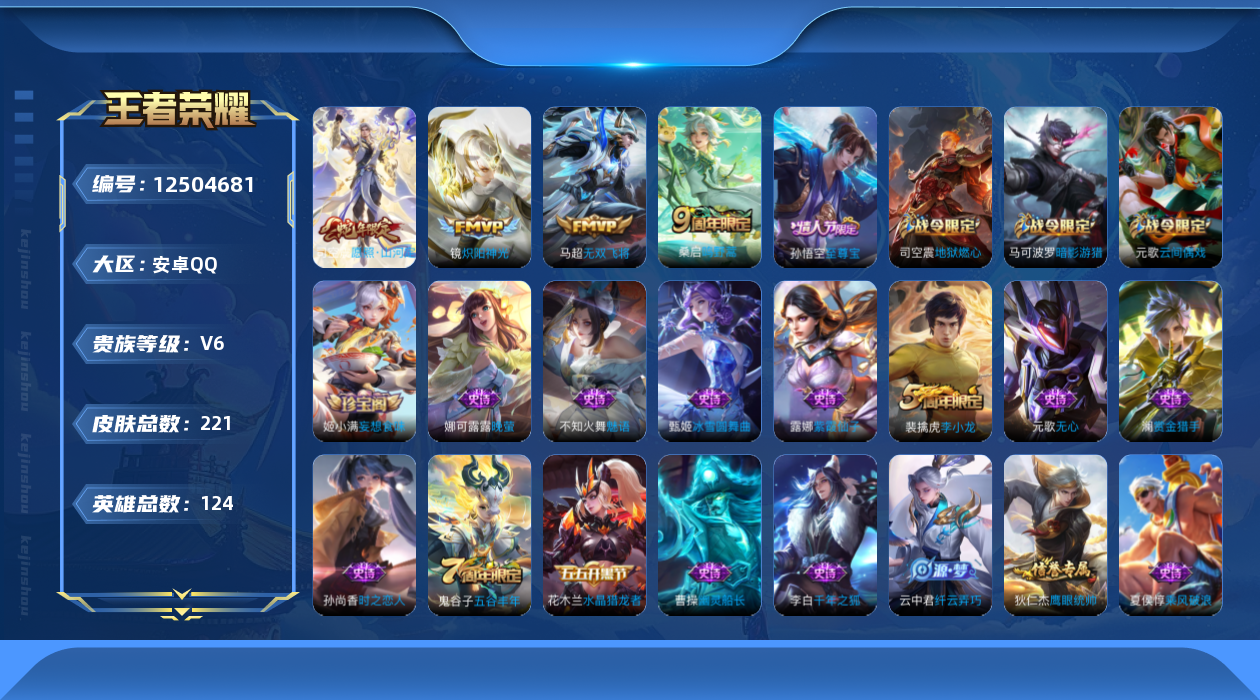 [12504681]【商品标题】:安卓Q-V0-至尊星耀III段位-124英雄-221皮肤-0典藏-0珍品无双-0无双-0珍品传说-4传说-61史诗