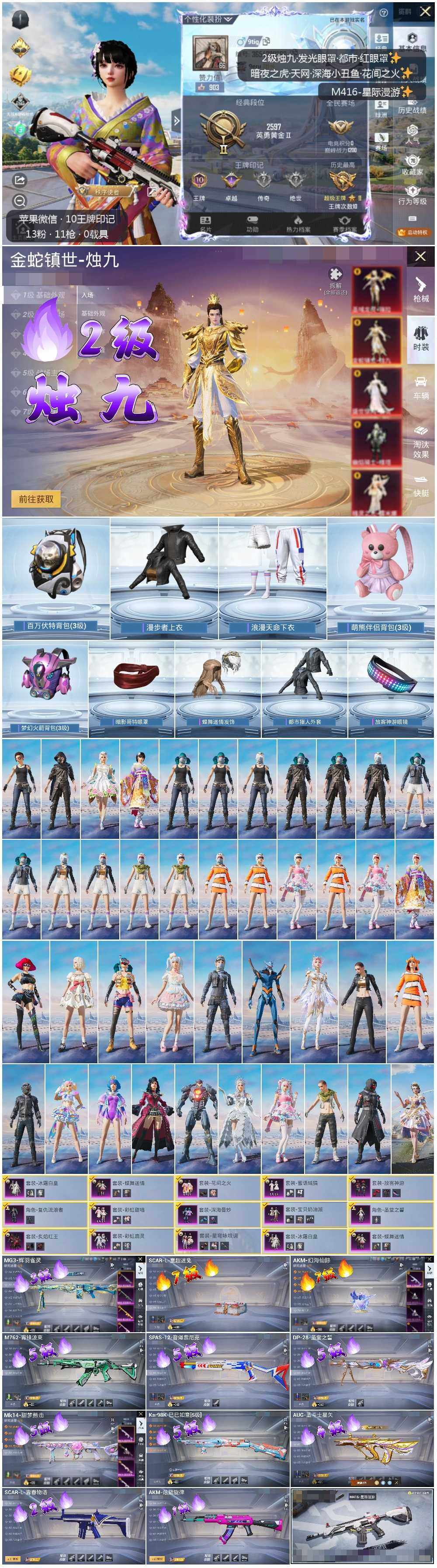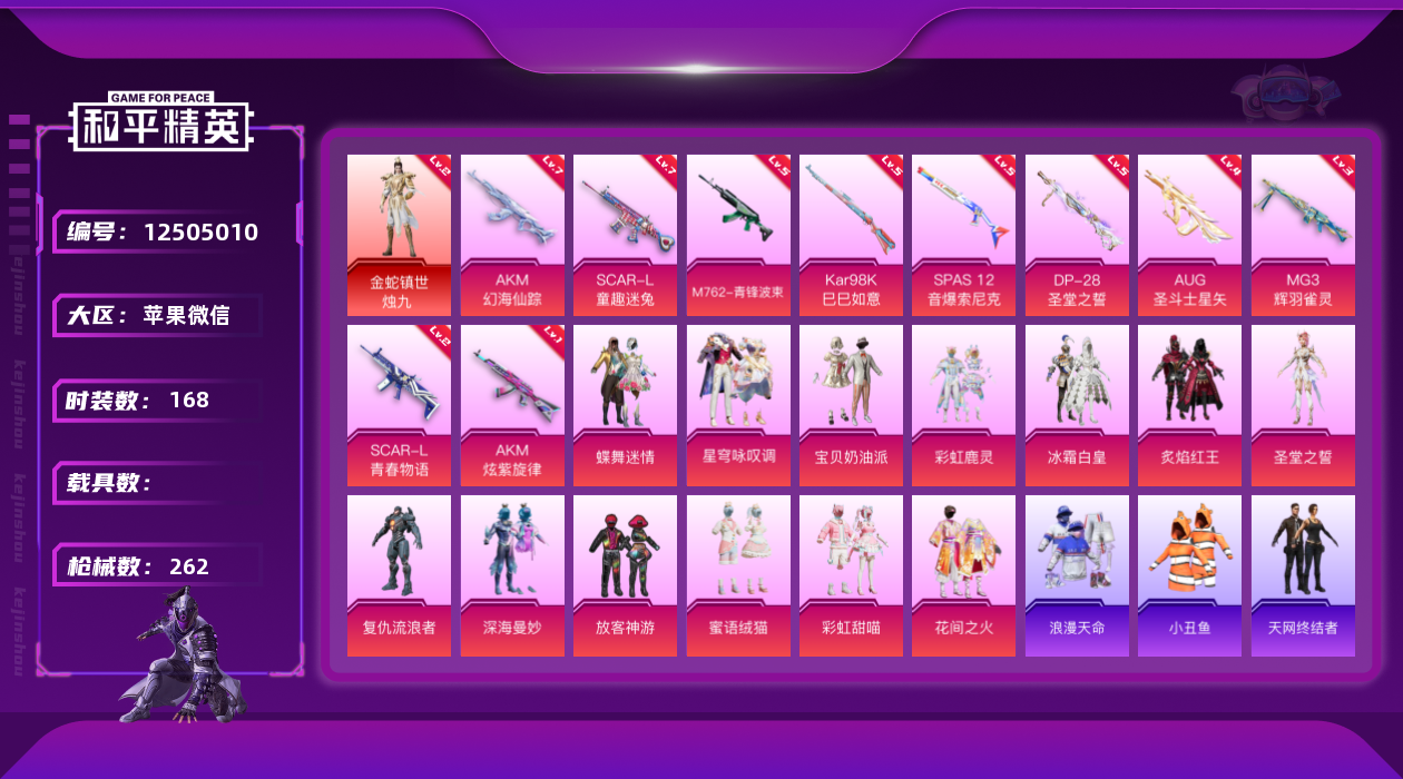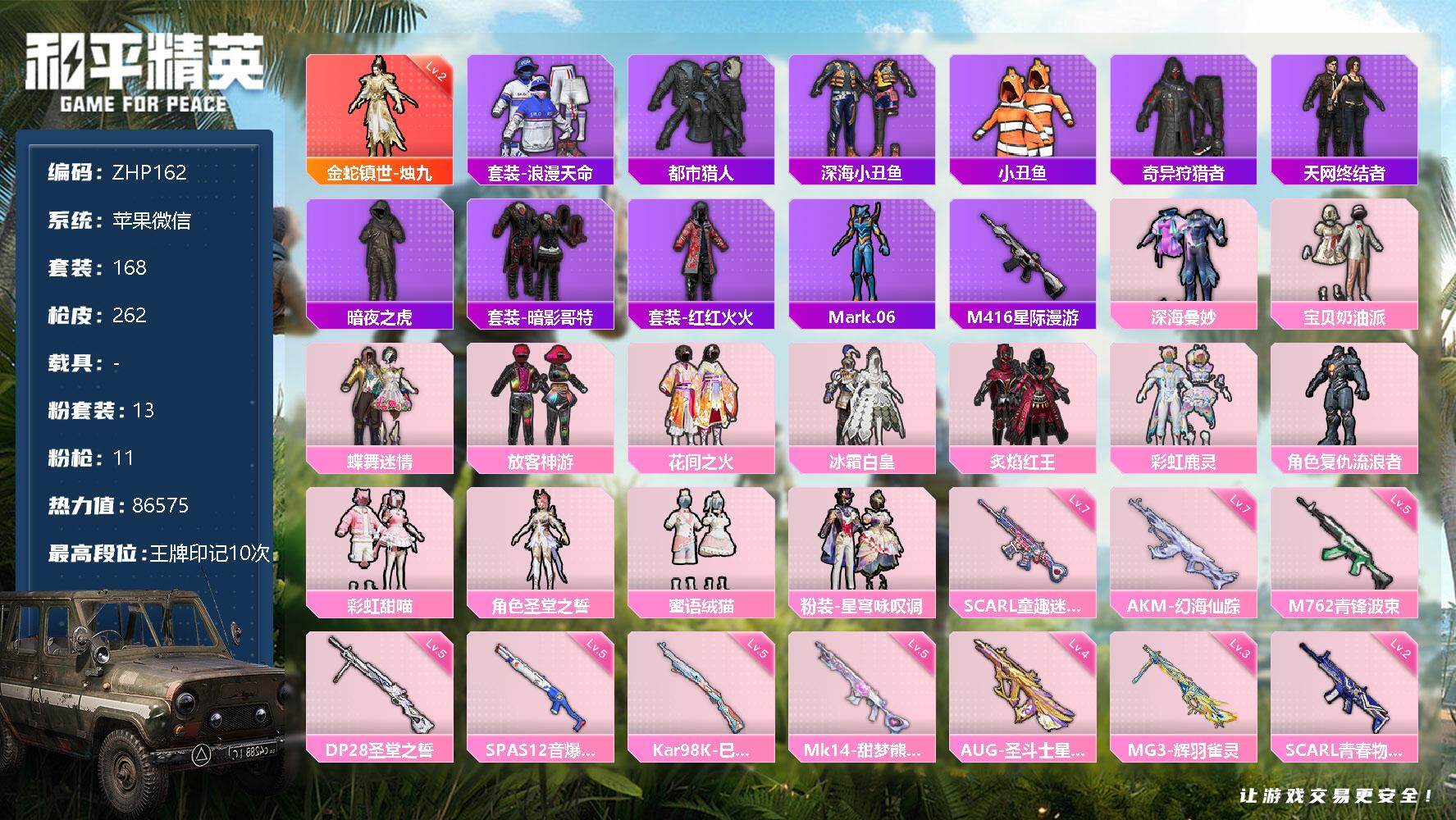 [12505010]【商品标题】:二级烛九!天网!苹果 微信-1神装-13粉装-11特效枪-0载具-5粉色飞行器-86575热力值-10王牌印记-168套装-262枪皮