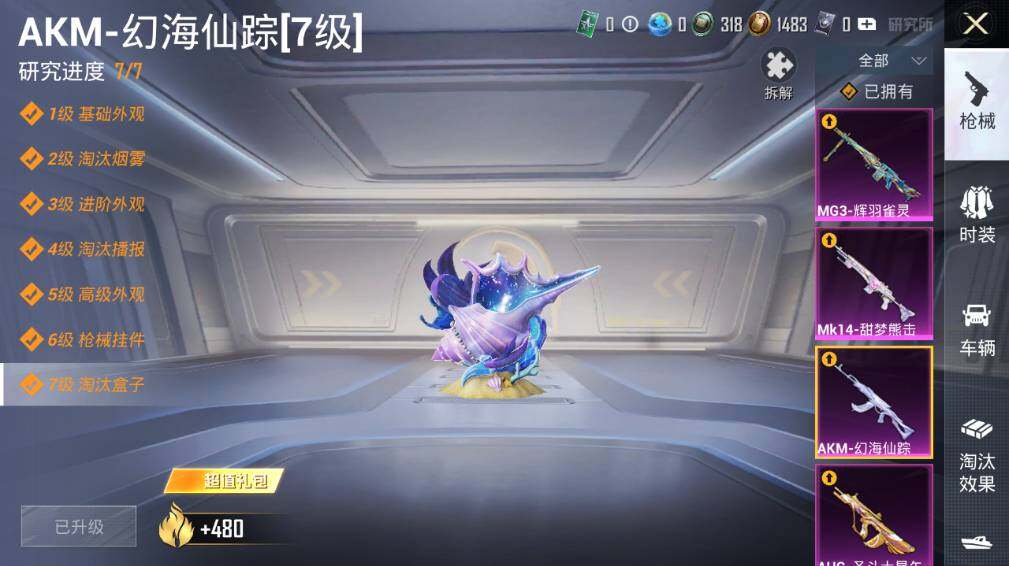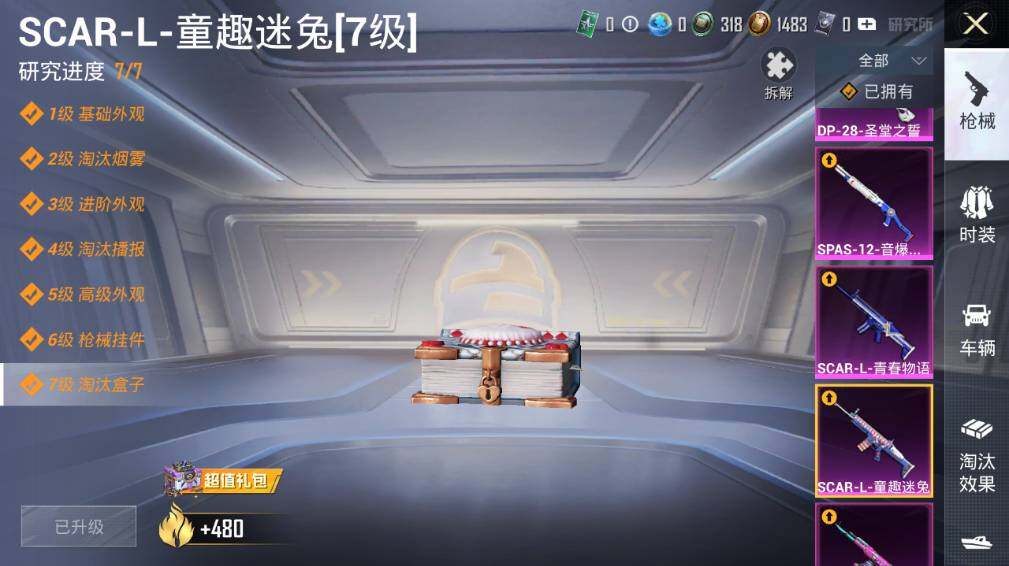 AKM-炫紫旋律,SCAR-L-童趣迷兔,SCAR-L-青春物语,M762-青锋波束,Kar98K-巳巳如意,SPAS-12-音爆索尼克,DP-28-圣堂之誓