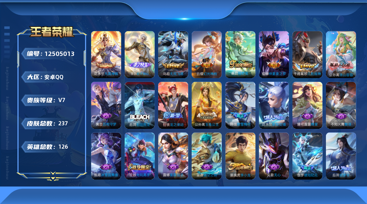 [12505013]【特价急出/详情看图/对抗39段】:安卓Q-V7-最强王者段位-127英雄-237皮肤-1典藏-1无双-5传说-67史诗