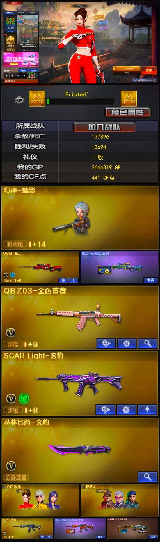 - [13950323]广西一区-54V-3王者-2炫金 【热门武器】:QBZ03-金色蔷薇,Scar Light-白虎,M200-幻神,金色蔷薇-古蛇迷踪,修罗-古蛇迷踪,M4A1-黑骑士,沙鹰-修罗 【王者炫金武器】:炫金骑士,炫金雷神 【音效卡】:M4A1-雷神音效卡,麒麟刺-百战金芒-盛典舞曲音效卡,炼狱-百战金芒-庆典舞曲音效卡 【皮肤】:M200-幻神-黄忠皮肤,幻神-宠儿-2021MVP,M200-幻神-荣耀世冠白鲨,Scar Light-白虎-暗星,QBZ03-AG-CFPLS19冠军,雷神-荣耀之魄,雷神-星空,M4A1-再燃火线,火麒麟-心动糖果,毁灭-冠军之怒,毁灭-神秘黑洞皮肤,M4A1-千变-孔明皮肤,极光-高能霹雳 皮肤,龙啸-巅峰荣耀 皮肤 【角色】:魅影,关小雨,战地猎狐,王者樱-热浪之夏,蛇隐宗,奇洋探员,乔伊教练,云海玲珑,暗夜-X,初恋灵狐,电竞少女,芳心审判者,飞虎队-X,风暴女,虎妞,嘉年华灵狐,娟娟,兰-海滩派对,兰-新年限定,灵狐者-X,麻雀,萌儿,潘多拉-X,潘多拉-甜心教官,蛇姬,斯沃特-X,铁骑荣耀,兔囡囡,游珑儿 【人偶武器】:AWM-灵狐-15周年嘉年华 【暴走生化】:超级对讲机 【挑战大师】:冰龙粉碎者-白马银枪,激光毁灭者III-白马银枪,神圣爆裂者-末日III 【英雄级武器】:M4A1-雷神*2,M4A1-黑骑士,AK12-天启,Scar Light-白虎,无影-神兵利器,QBZ03-云龙,黑武士-锦绣游龙,超新星-热带奇洋,金色蔷薇-古蛇迷踪,QBZ03-金色蔷薇,Barrett-毁灭,AWM-裁决,M200-幻神,炼狱-百战金芒,沙鹰-修罗,柯尔特-竞技荣光,COP 357-云龙*2,修罗-古蛇迷踪,屠龙,龙啸-热带奇洋,麒麟刺-百战金芒,高爆手雷-雷暴,高爆手雷-幻灵,高爆手雷-竞技荣光*5,高爆手雷-云龙*3,手雷-热带奇洋,高爆手雷-古蛇迷踪,闪光弹-雷暴,闪光弹-幻灵,闪光弹-竞技荣光*5,闪光弹-云龙,闪光弹-雷霆王者-觉醒版,烟雾弹-幻灵,烟雾弹-竞技荣光*8,烟雾弹-云龙,烟雾弹-古蛇迷踪,M4A1-赤狱骑士,AWM-昌龙,Barrett-碧霄极光 【道具】:BS战队炫彩背包,CFS限定背包,全能枪王背包,古蛇迷踪炫彩背包,奇洋探员-海龟背包,炫彩背包,热带奇洋炫彩背包,百战金芒炫彩背包,超级背包,女皇终结者