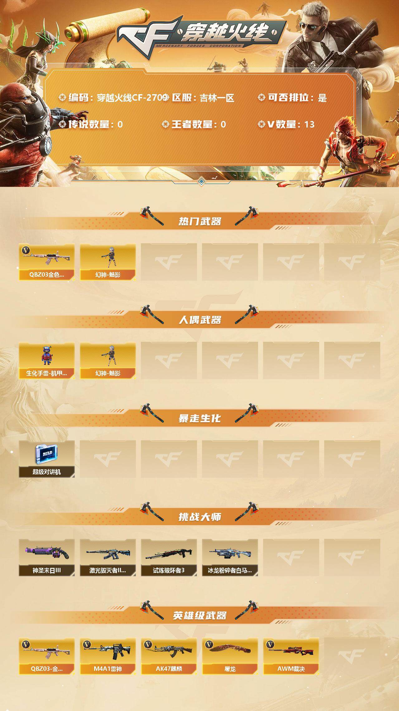 [12506373]【商品标题】:吉林一区-13V-0王者-0炫金 【热门武器】:QBZ03-金色蔷薇,幻神-魅影 【人偶武器】:幻神-魅影,生化手雷-机甲核心 【暴走生化】:超级对讲机 【挑战大师】:神圣爆裂者-末日III,试炼破坏者III,激光毁灭者III-白马银枪,冰龙粉碎者-白马银枪 【英雄级武器】:QBZ03-金色蔷薇,M4A1-雷神,AK47-麒麟,AWM-裁决,屠龙*2 【特殊枪械】: