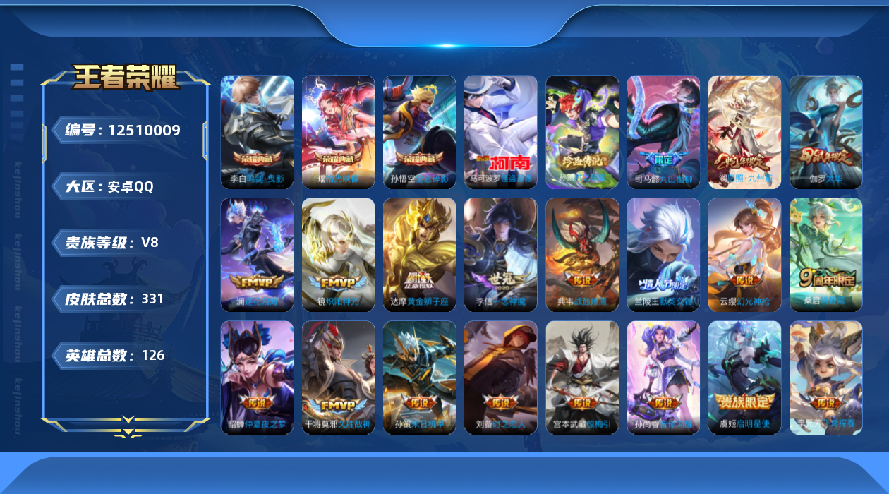 [12510009]【商品标题】:安卓Q-V8-永恒钻石I段位-126英雄-331皮肤-3典藏-0珍品无双-0无双-2珍品传说-20传说-109史诗