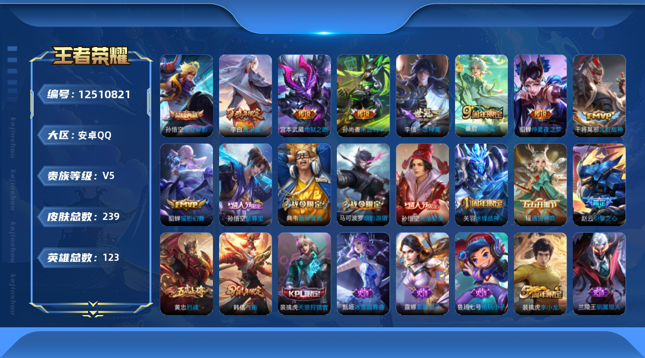 [12510821]【商品标题】:安卓Q-V5-尊贵铂金II段位-123英雄-239皮肤-1典藏-0珍品无双-0无双-0珍品传说-8传说-66史诗