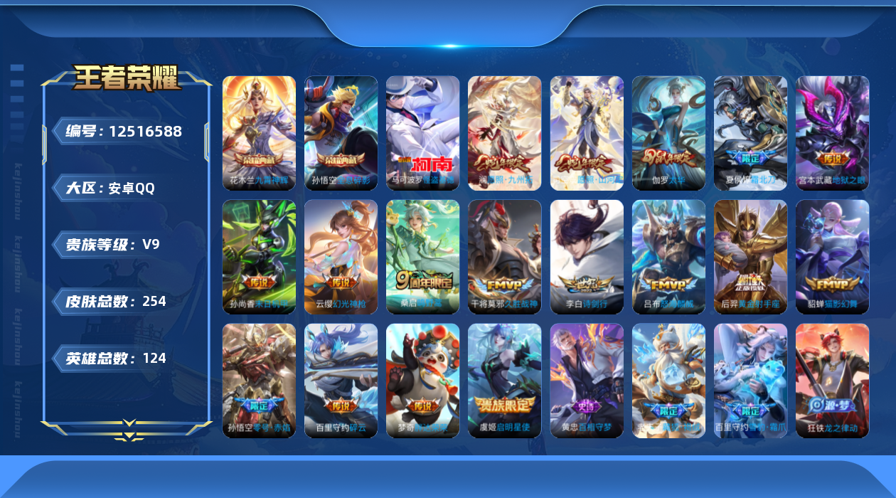 [12516588]【商品标题】:安卓Q-V9-至尊星耀IV段位-124英雄-254皮肤-2典藏-0珍品无双-0无双-1珍品传说-17传说-63史诗