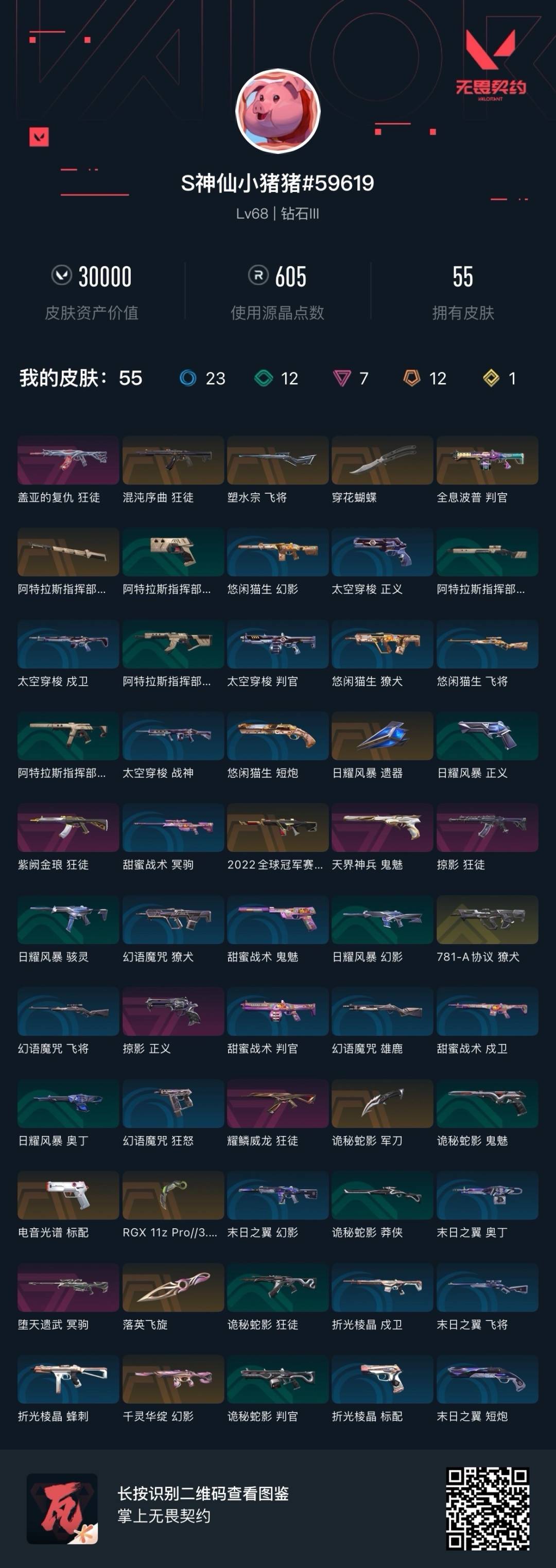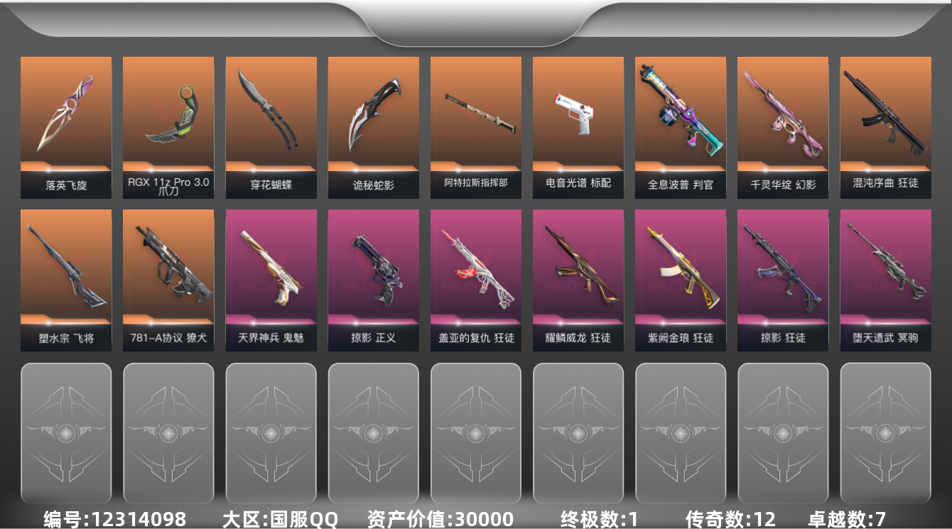 [12314098]12橙皮 1金皮 7紫皮 55皮肤 19英雄 52卡面 605已用源晶 钻石 优质装备:幻影-千灵华绽,狂徒-混沌序曲,狂徒-掠影,狂徒-紫阙金琅,狂徒-盖亚的复仇,獠犬-781-A协议,冥驹-堕天遗武,正义-掠影,鬼魅-天界神兵,判官-全息波普,飞将-塑水宗,狂徒-耀鳞威龙,落英飞旋,爪刀-RGX 11z Pro 3.0,穿花蝴蝶,诡秘蛇影,阿特拉斯指挥部 佩枪皮肤:标配-电音光谱