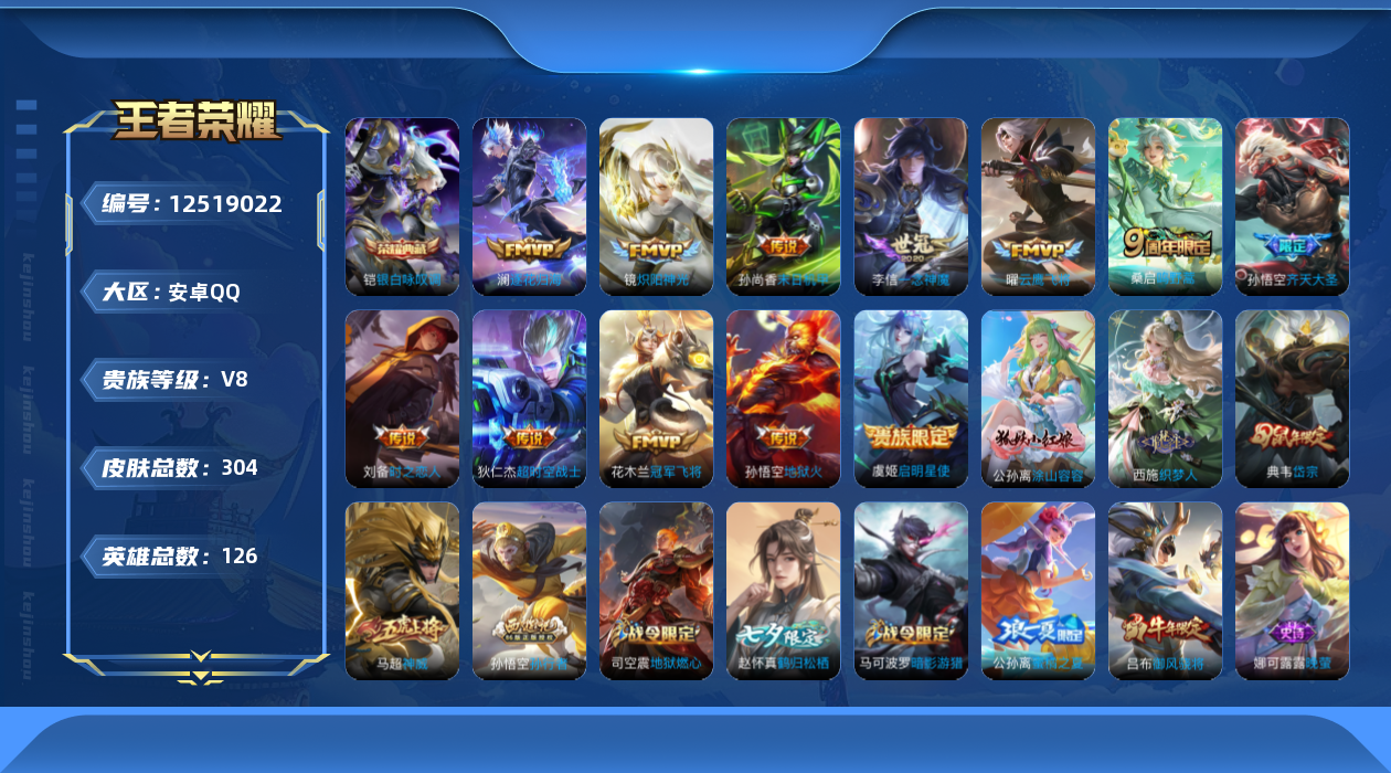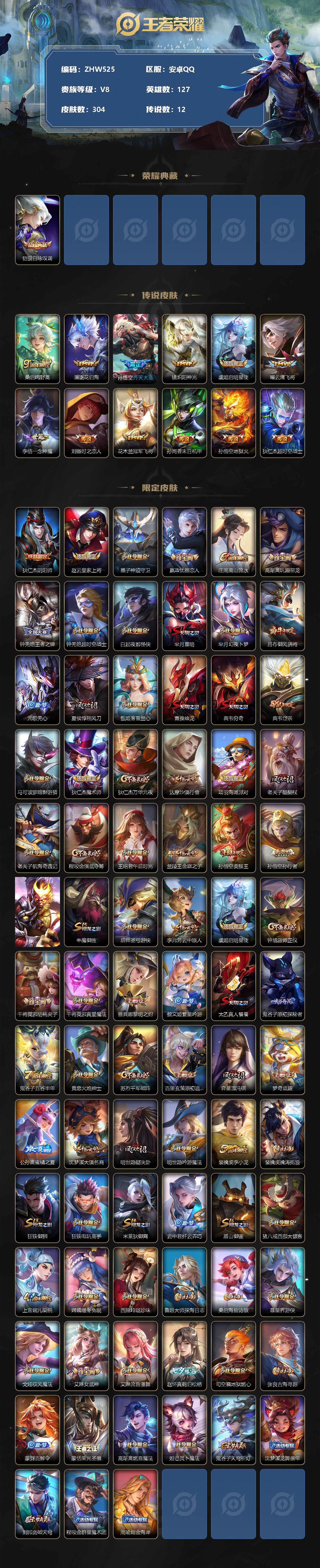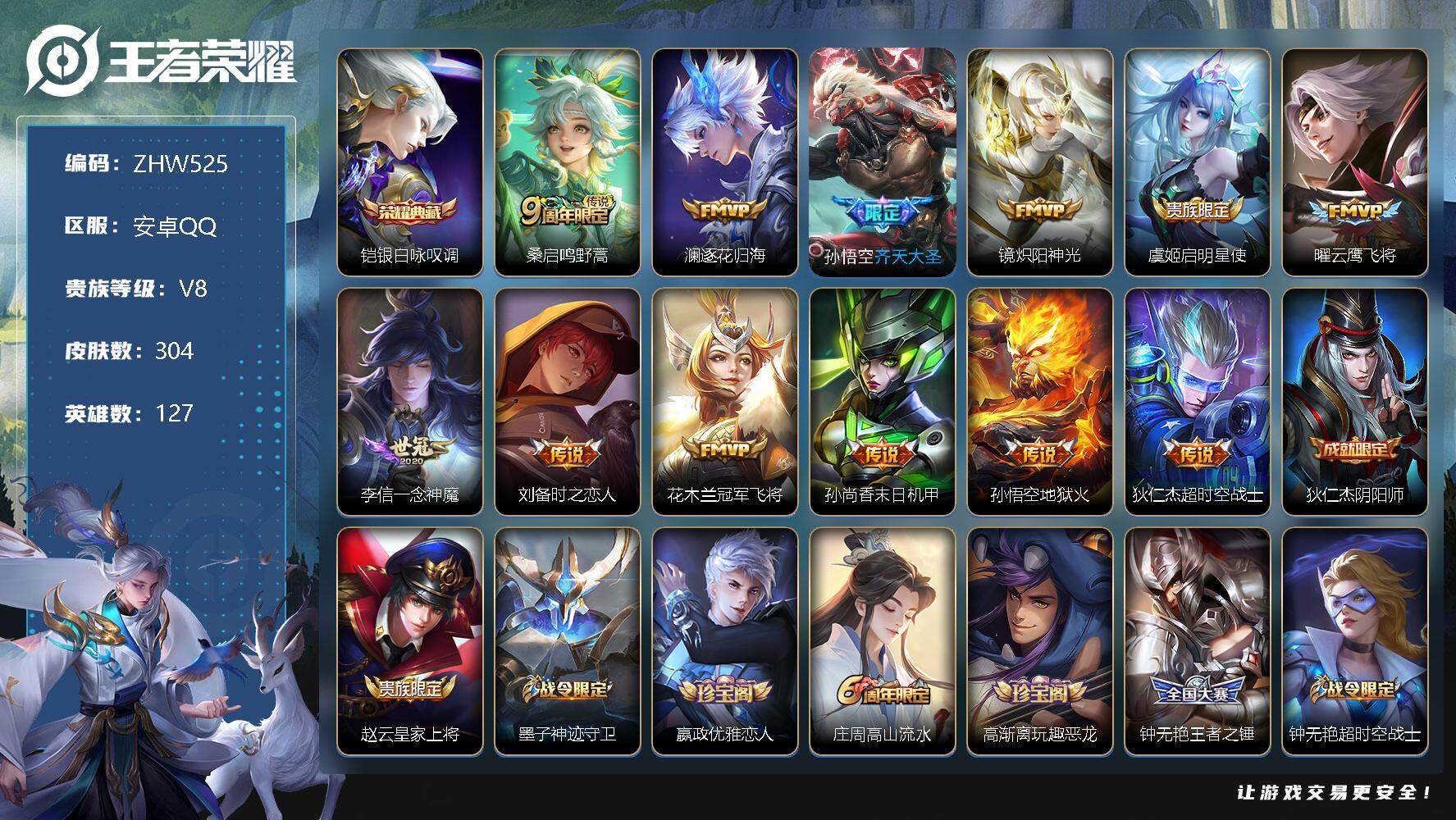 [12519022]【特价急出/详情看图】:安卓Q-V8-最强王者段位-127英雄-304皮肤-1典藏-12传说-83史诗