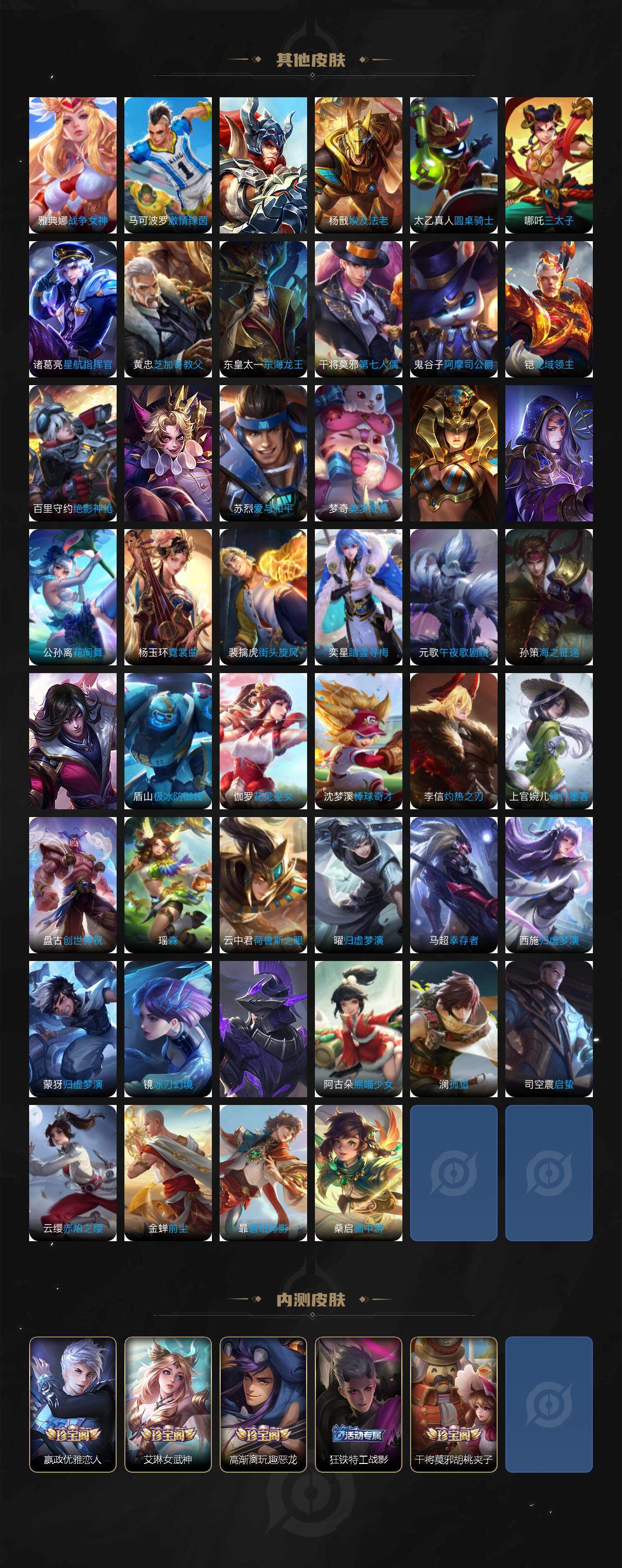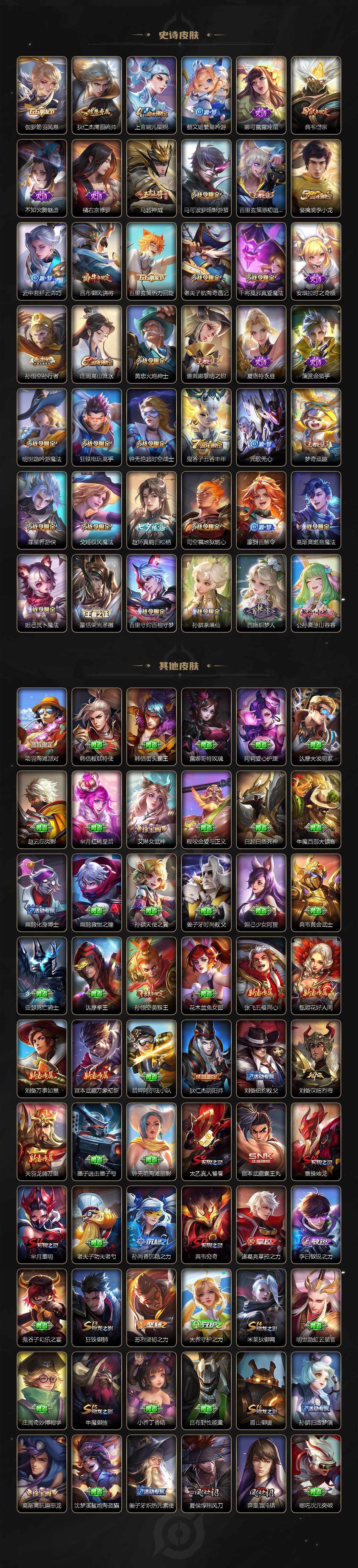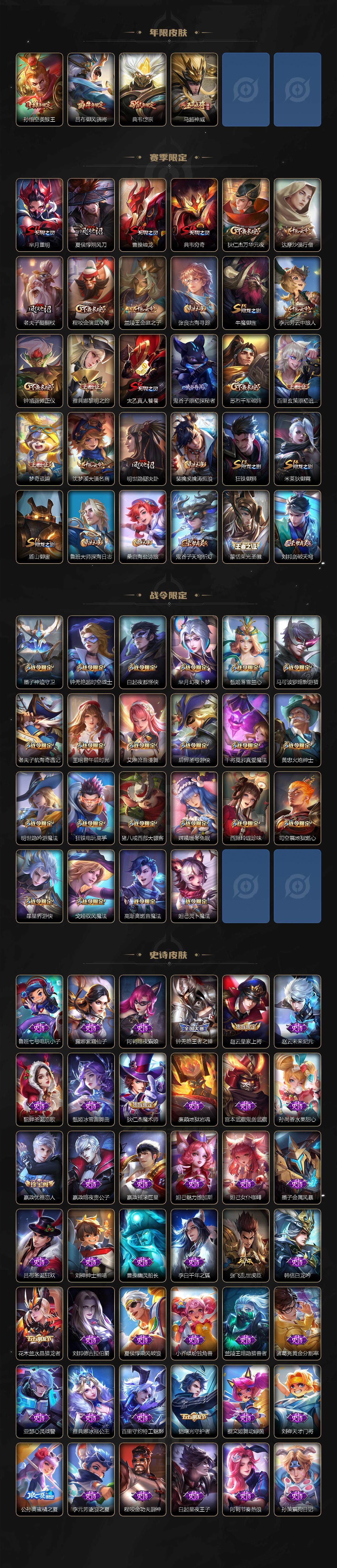 【限定皮肤】:狄仁杰阴阳师,赵云皇家上将,墨子神迹守卫,嬴政优雅恋人,庄周高山流水,高渐离玩趣恶龙,钟无艳王者之锤,钟无艳超时空战士,白起夜都怪侠,芈月重明,芈月幻夜卜梦,吕布御风骁将,元歌无心,夏侯惇朔风刀,甄姬落雪兰心,曹操烛龙,典韦穷奇,典韦岱宗,马可波罗暗影游猎,狄仁杰魔术师,狄仁杰万华元夜,达摩沙漠行僧,项羽海滩派对,老夫子醍醐杖,老夫子航海奇遇记,程咬金演武夺筹,王昭君午后时光,兰陵王金庭之子,孙悟空美猴王,孙悟空孙行者,孙悟空齐天大圣,牛魔御旌,后羿圣弓游侠,李元芳云中旅人,虞姬启明星使,钟馗驱傩正仪,干将莫邪胡桃夹子,干将莫邪真爱魔法,雅典娜黎明之约,蔡文姬繁星吟游,太乙真人饕餮,鬼谷子原初探秘者,鬼谷子五谷丰年,黄忠火炮绅士,苏烈千军破阵,百里玄策原初追逐者,弈星混沌棋,梦奇顽趣,公孙离蜜橘之夏,沈梦溪大漠名商,明世隐疑决卦,明世隐吟游魔法,裴擒虎李小龙,裴擒虎擒涛扼浪,狂铁御狮,狂铁电玩高手,米莱狄御霄,云中君纤云弄巧,盾山御銮,猪八戒西部大镖客,上官婉儿梁祝,嫦娥暖冬兔眠,西施玲珑珍味,鲁班大师探海日志,桑启海盐诗旅,暃星界游侠,戈娅驭风魔法,艾琳女武神,艾琳流音漫舞,赵怀真鹤归松栖,司空震地狱燃心,张良古海寻踪,蒙犽百解令,蒙恬荣光圣徽,高渐离燃音魔法,妲己灵卜魔法,鬼谷子天穹祈灯,沈梦溪龙舞盛年,刘邦剑破天穹,程咬金群星魔术团,周瑜熔金海岸