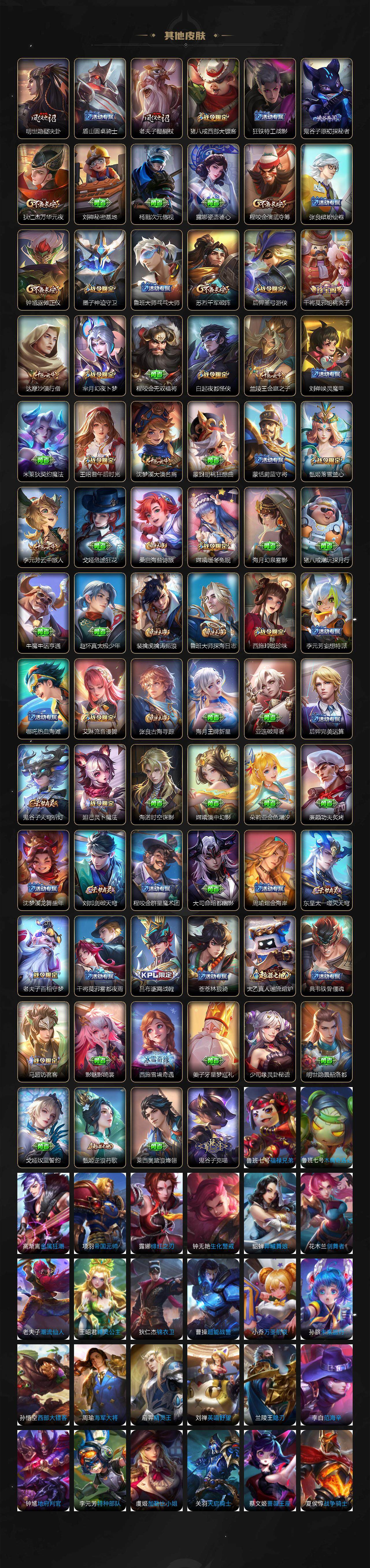 娜可露露晚萤,伽罗箭羽风息,李元芳逐浪之夏,不知火舞魅语,孙策猫狗日记,阿轲节奏热浪,露娜紫霞仙子,诸葛亮黄金分割率,韩信白龙吟,阿轲暗夜猫娘,雅典娜冰冠公主,鲁班七号电玩小子,橘右京修罗,嬴政摇滚巨星,刘禅绅士熊喵,刘禅天才门将,白起星夜王子,安琪拉时之奇旅,程咬金功夫厨神,刘邦德古拉伯爵,兰陵王暗隐猎兽者,曹操幽灵船长,宫本武藏鬼剑武藏,亚瑟心灵战警,蔡文姬舞动绿茵,廉颇地狱岩魂,小乔缤纷独角兽,夏侯惇乘风破浪,花木兰水晶猎龙者,铠曙光守护者,百里玄策热力回旋,墨子金属风暴,百里玄策原初追逐者,吕布圣诞狂欢,貂蝉圣诞恋歌,百里守约特工魅影,嬴政暗夜贵公子,雅典娜黎明之约,李白千年之狐,夏洛特永昼,澜赏金猎手,赵怀真鹤归松栖,蒙犽百解令,高渐离燃音魔法