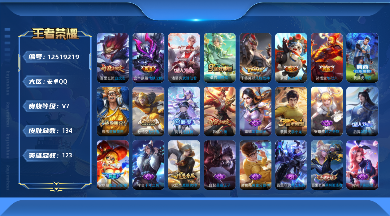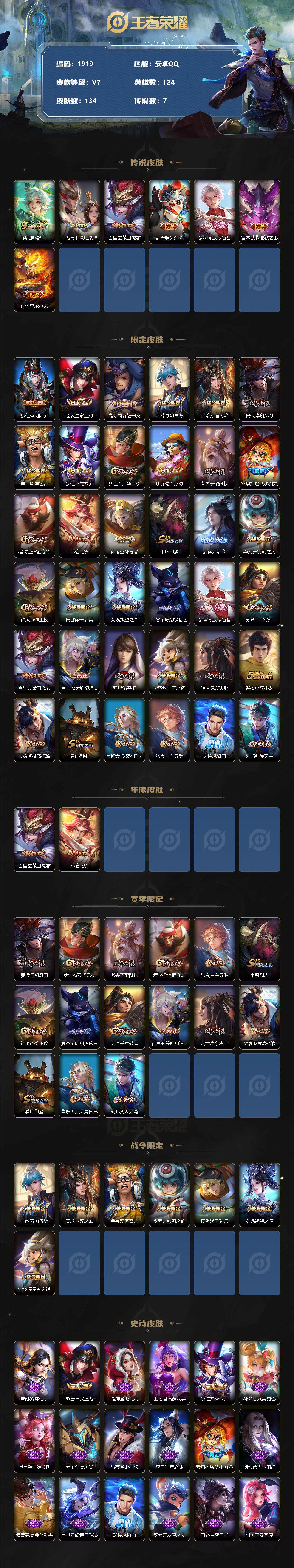 [12519219]【商品标题】:安卓Q-V4-永恒钻石I段位-124英雄-134皮肤-0典藏-0珍品无双-0无双-0珍品传说-7传说-32史诗