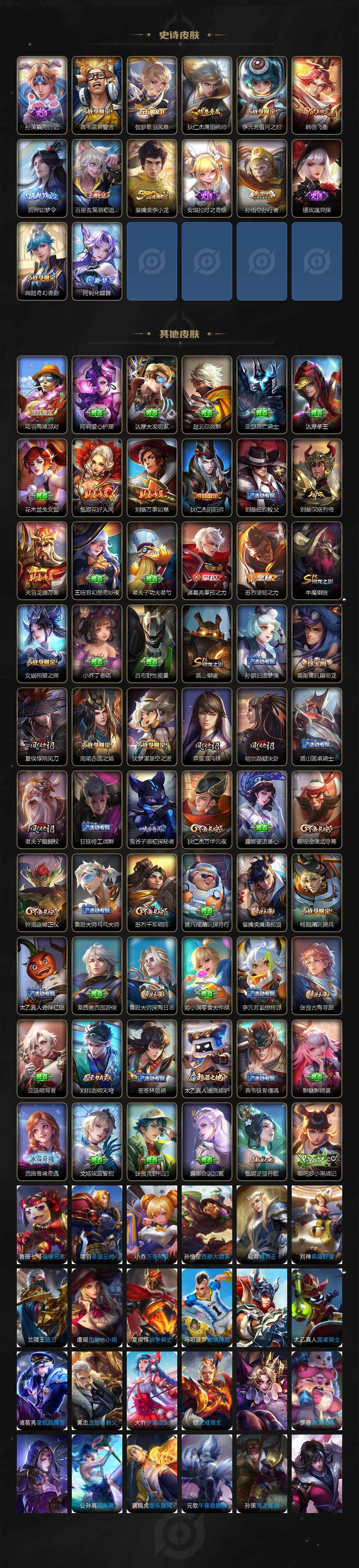 【史诗皮肤】:露娜紫霞仙子,赵云皇家上将,貂蝉圣诞恋歌,王昭君偶像歌手,狄仁杰魔术师,孙尚香水果甜心,妲己魅力维加斯,墨子金属风暴,吕布圣诞狂欢,李白千年之狐,安琪拉魔法小厨娘,刘邦德古拉伯爵,诸葛亮黄金分割率,百里守约特工魅影,裴擒虎梅西,李元芳逐浪之夏,白起星夜王子,阿轲节奏热浪,孙策猫狗日记,典韦蓝屏警告,伽罗箭羽风息,狄仁杰鹰眼统帅,李元芳银河之约,韩信飞衡,后羿如梦令,百里玄策原初追逐者,裴擒虎李小龙,安琪拉时之奇旅,孙悟空孙行者,镜玫瑰异探,扁鹊奇幻香踪,阿轲化蝶舞