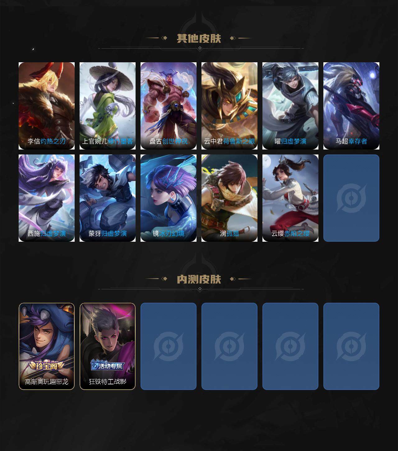 【其他皮肤】:项羽海滩派对,阿轲爱心护理,达摩大发明家,赵云忍炎影,亚瑟死亡骑士,达摩拳王,花木兰兔女郎,甄姬花好人间,刘备万事如意,狄仁杰阴阳师,刘备纽约教父,刘备汉昭烈帝,关羽龙腾万里,王昭君幻想奇妙夜,老夫子功夫老勺,诸葛亮掌控之力,苏烈坚韧之力,牛魔御旌,女娲朔望之晖,小乔丁香结,吕布野性能量,盾