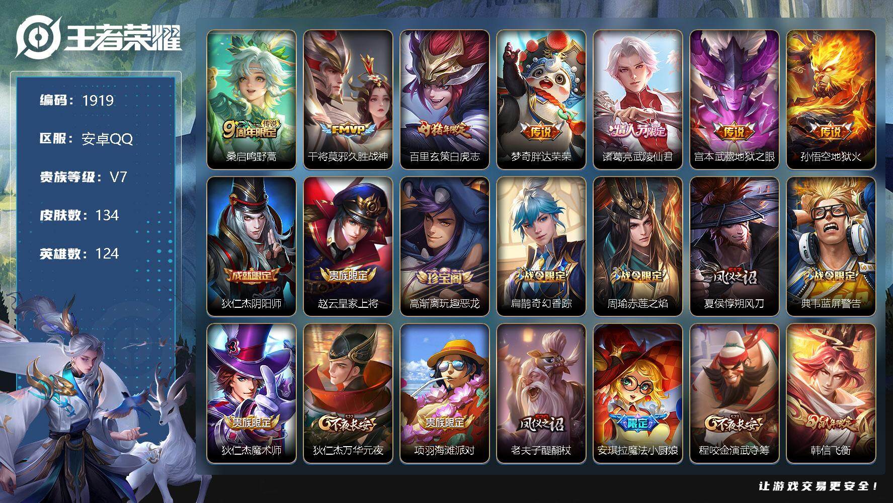 - [12030103]V8 1典藏 1珍品传说 10传说 124英雄 294皮肤 可修改实名 优质装备:弑枪猎影(韩信典藏),怪盗基德,一念神魔,地狱之眼,超时空战士-狄仁杰,音你闪耀(rap皮),山海·炽霜斩(李信年限),澜逐花归海,琥珀纪元铠 珍宝阁皮:万物之道,玩趣恶龙 限定皮:鸣野蒿,至尊宝,齐天大圣,五谷丰年,辉光之辰,大圣娶亲,神奇女侠,唐三藏,时之奇旅-妲己 史诗皮:鸭鸭历险记-刘禅,飞车小橘子,谪仙醉月,龙之律动,茶境仙,琥珀纪元伽罗,决胜骁骑,蔬乡物语(鲁班七号),百相守梦-百里守约,紫霞仙子,黄金分割率,特工魅影,千年之狐,江河有灵,魅语,百解令(蒙犽),高渐离燃音魔法,白蛇,晚萤,电玩·爆裂旋风,暗夜猫娘,龙骑士(小龙虾),末日机甲-吕布,猫狗日记-孙策,猫狗日记-大乔,乱世虎臣,修罗,女仆咖啡,摇滚巨星,水果甜心,天才门将,心灵骇客,功夫厨神,德古拉伯爵,暗隐猎兽者,幽灵船长,鬼剑武藏,心灵战警,舞动绿茵,地狱岩魂,纤云弄巧,拒霜思,乘风破浪,逐浪之夏,水晶猎龙者,曙光守护者,金属风暴,圣诞狂欢,鹰眼统帅,魅力维加斯,赏金猎手,无心,未来纪元-赵云
