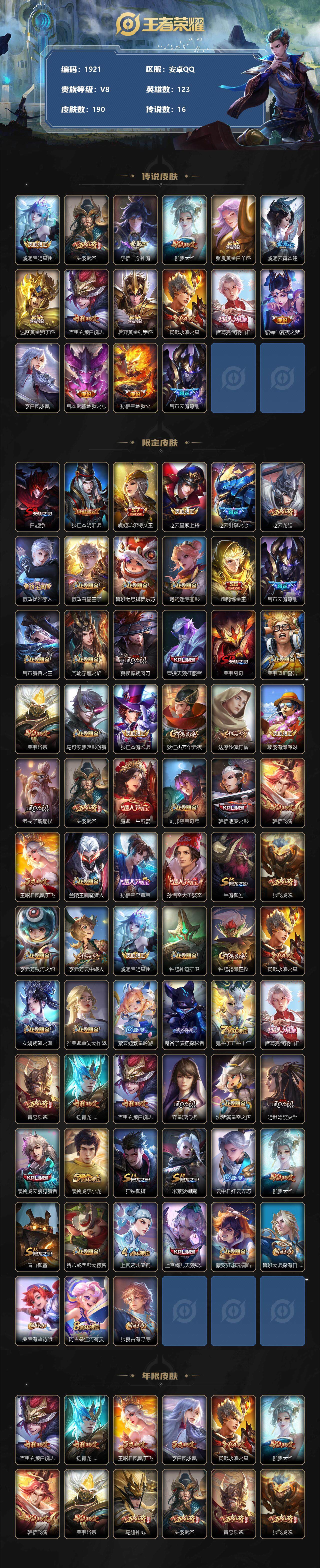 - [12293089]V8 1典藏 1珍品传说 23传说 124英雄 287皮肤 可修改实名 优质装备:弑枪猎影(韩信典藏),黑崎一护,黄金狮子座,云鹰飞将(小将军),炽阳神光,一念神魔,地狱火,地狱之眼,无双飞将,山海·炽霜斩(李信年限),山海·苍雷引(电光曜子),惊梅引 传说皮:乘龙·铭钟鼎(赵云年限),典韦战鼓燎原 珍宝阁皮:优雅恋人,蔷薇恋人,玩趣恶龙 限定皮:愿照·九州拓(澜年限),愿照·山河定(司空震年限),鸣野蒿,至尊宝,傲雪梅枪,时雨天司(水龙头),飞衡(韩信年限),影龙天霄,高山流水,诗剑行,齐天大圣,怒海麟威,五谷丰年,青龙志(铠年限),梁祝,岱宗(典韦年限),李小龙,孙行者,大圣娶亲,引擎之心,寅虎·赤拳(老虎年限),深海之息(深海大菠萝),山海·玄木吟(马可年限) 史诗皮:器灵·浮梦炉,星界战将,龙之律动,石田雨龙,茶境仙,怒海争锋,破空之剑,百相守梦-百里守约,百相守梦-黄忠,紫霞仙子,黄金分割率,特工魅影,千年之狐,江河有灵,百解令(蒙犽),蒙恬荣光圣徽,匿光破解者,偶像歌手,电玩·爆裂旋风,百相守梦(刘备),龙骑士(小龙虾),猫狗日记-孙策,乱世虎臣,节奏热浪,修罗,女仆咖啡,摇滚巨星,水果甜心,星夜王子,功夫厨神,德古拉伯爵,暗隐猎兽者,幽灵船长,鬼剑武藏,暗渊魔法,心灵战警,舞动绿茵,地狱岩魂,拒霜思,乘风破浪,水晶猎龙者,热力回旋,金属风暴,原初追逐者,圣诞恋歌,鹰眼统帅,魅力维加斯,赏金猎手,无心,未来纪元-赵云