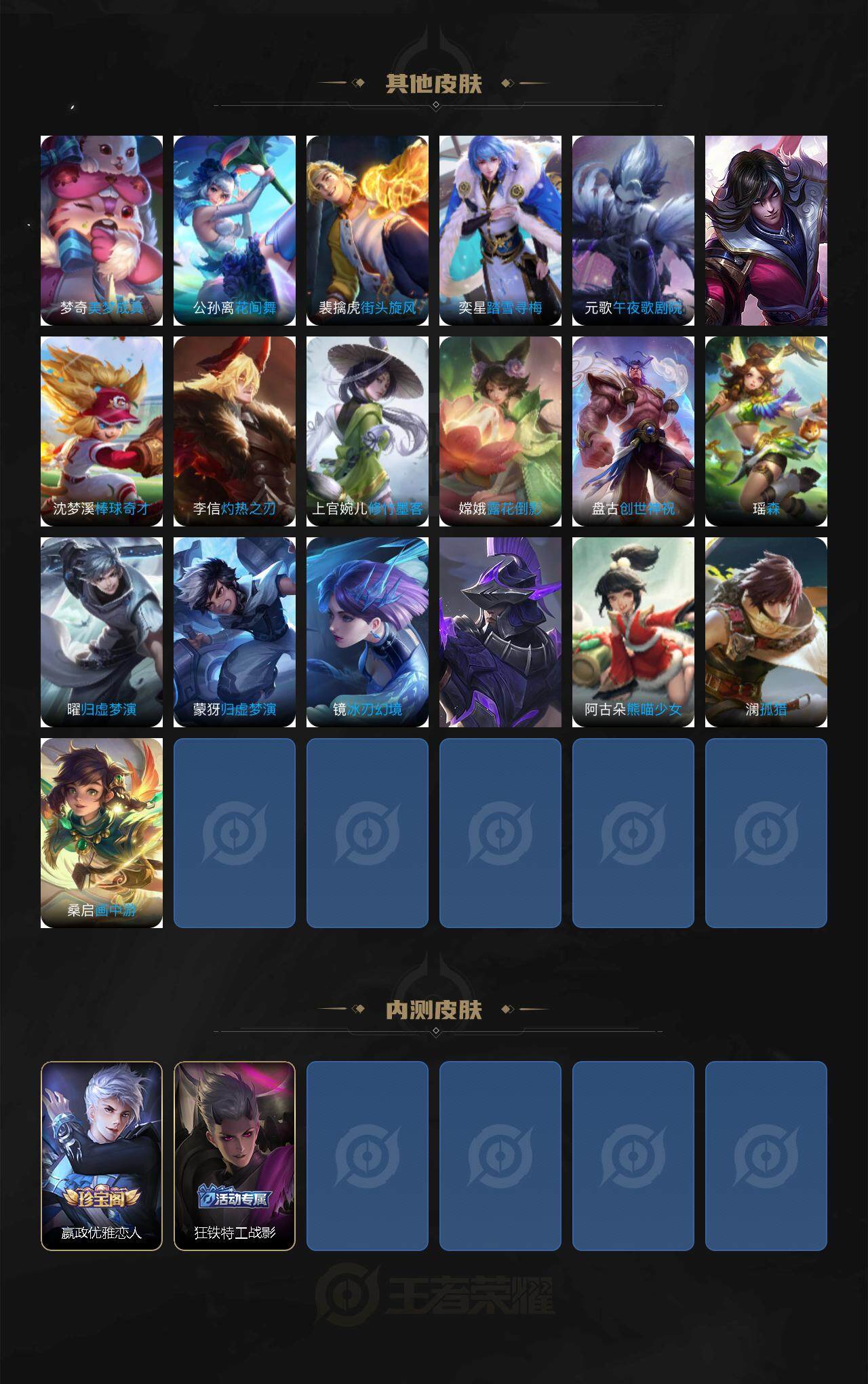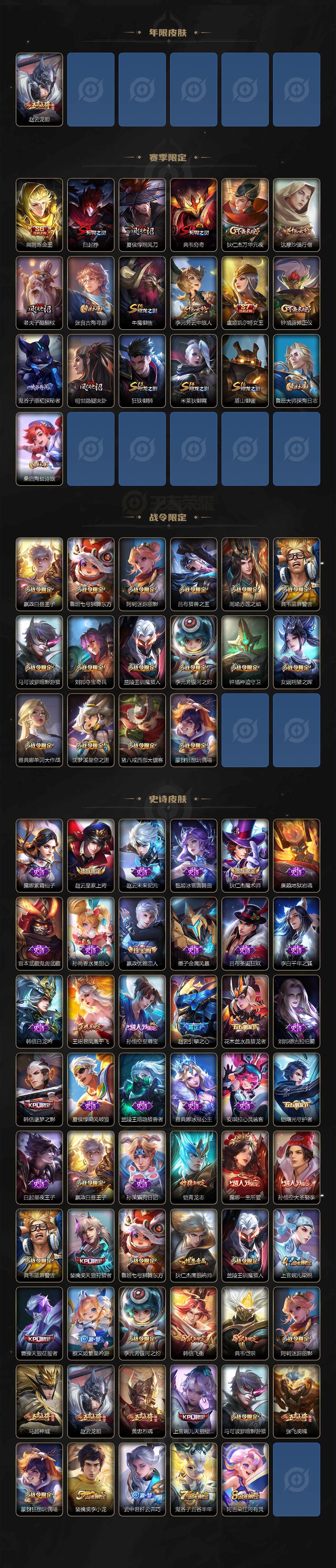 【限定皮肤】:白起狰,狄仁杰阴阳师,虞姬凯尔特女王,赵云皇家上将,赵云引擎之心,赵云龙胆,嬴政优雅恋人,嬴政白昼王子,鲁班七号狮舞东方,阿轲迷踪丽影,扁鹊炼金王,吕布天魔缭乱,吕布猎兽之王,周瑜赤莲之焰,夏侯惇朔风刀,曹操天狼征服者,典韦穷奇,典韦蓝屏警告,典韦岱宗,马可波罗暗影游猎,狄仁杰魔术师,狄仁杰万华元夜,达摩沙漠行僧,项羽海滩派对,老夫子醍醐杖,关羽武圣,露娜一生所爱,刘邦夺宝奇兵,韩信逐梦之影,韩信飞衡,王昭君凤凰于飞,兰陵王驯魔猎人,孙悟空至尊宝,孙悟空大圣娶亲,牛魔御旌,张飞虎魄,李元芳银河之约,李元芳云中旅人,虞姬启明星使,钟馗神迹守卫,钟馗驱傩正仪,杨戬永曜之星,女娲朔望之晖,雅典娜单词大作战,蔡文姬繁星吟游,鬼谷子原初探秘者,鬼谷子五谷丰年,诸葛亮武陵仙君,黄忠烈魂,铠青龙志,百里玄策白虎志,弈星混沌棋,沈梦溪星空之诺,明世隐疑决卦,裴擒虎天狼狩猎者,裴擒虎李小龙,狂铁御狮,米莱狄御霄,云中君纤云弄巧,伽罗太华,盾山御銮,猪八戒西部大镖客,上官婉儿梁祝,上官婉儿天狼绘梦者,蒙犽狂想玩偶喵,鲁班大师探海日志,桑启海盐诗旅,阿古朵江河有灵,张良古海寻踪
