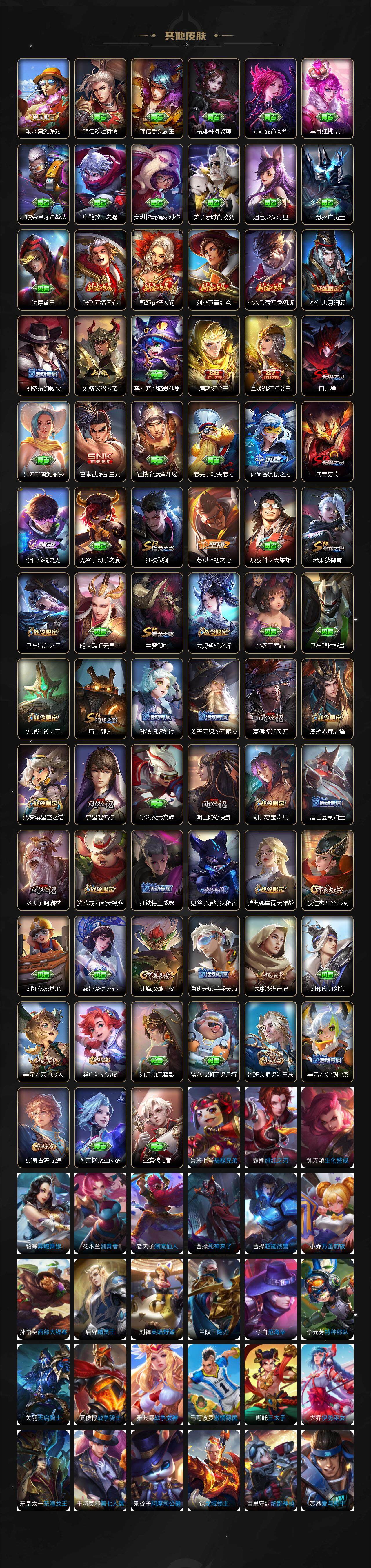 扁鹊炼金王,虞姬凯尔特女王,白起狰,典韦穷奇,狂铁御狮,米莱狄御霄,牛魔御旌,盾山御銮,夏侯惇朔风刀,明世隐疑决卦,老夫子醍醐杖,鬼谷子原初探秘者,狄仁杰万华元夜,钟馗驱傩正仪,吕布猎兽之王,嬴政白昼王子,女娲朔望之晖,典韦蓝屏警告,钟馗神迹守卫,鲁班七号狮舞东方,沈梦溪星空之诺,李元芳银河之约,刘邦夺宝奇兵,马可波罗暗影游猎,蒙犽狂想玩偶喵,弈星混沌棋,达摩沙漠行僧,李元芳云中旅人,桑启海盐诗旅,鲁班大师探海日志,张良古海寻踪