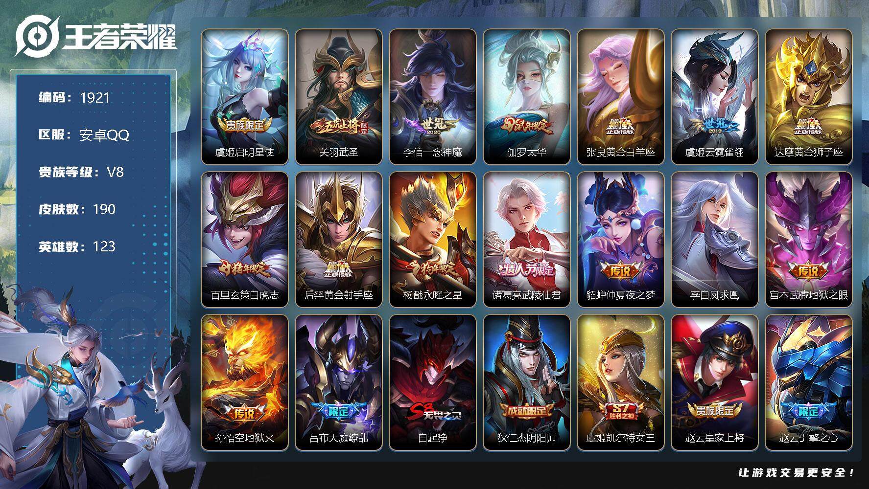 [12519254]【商品标题】:安卓Q-V1-秩序白银I段位-123英雄-190皮肤-0典藏-0珍品无双-0无双-0珍品传说-16传说-53史诗