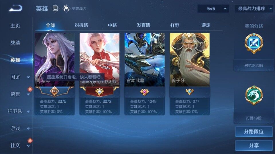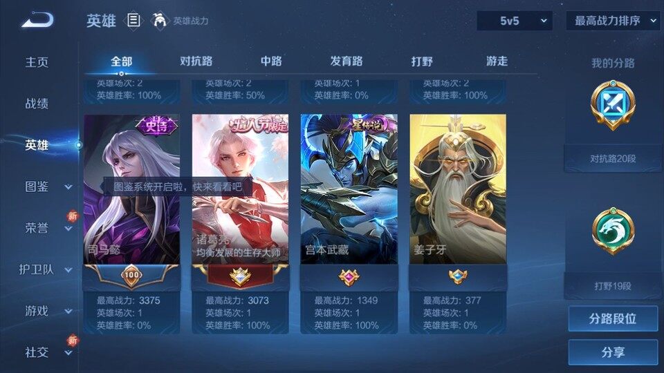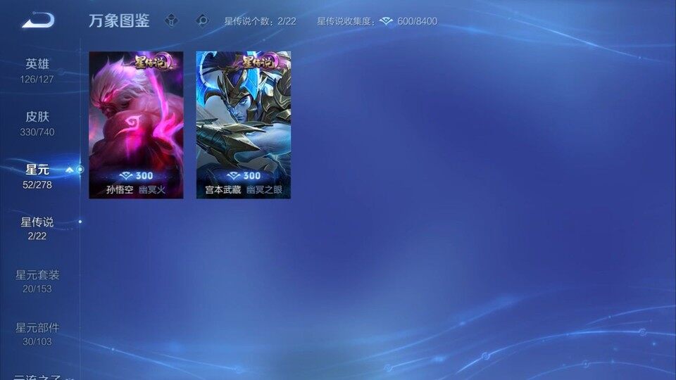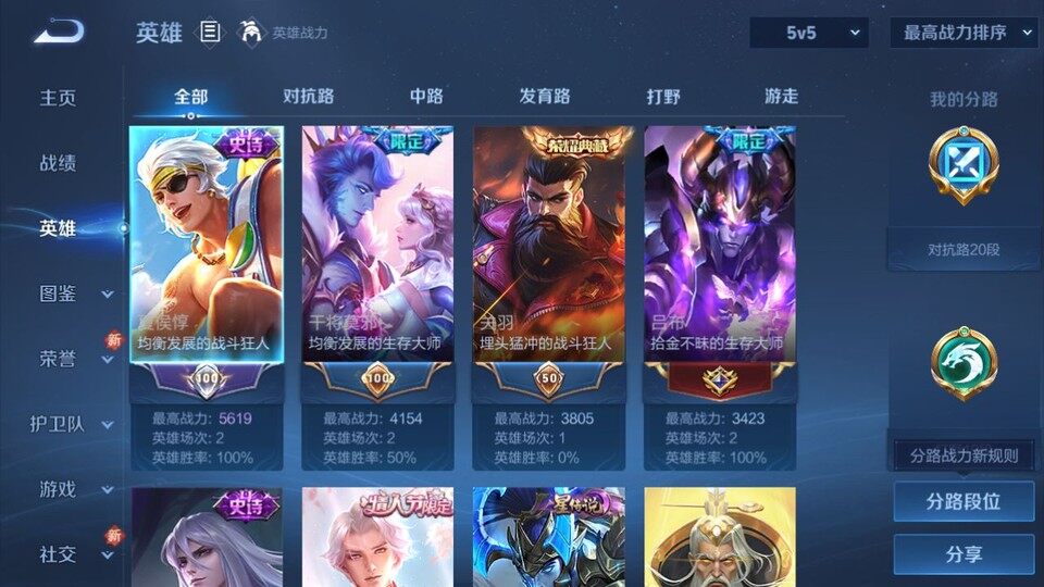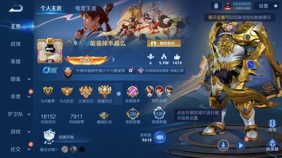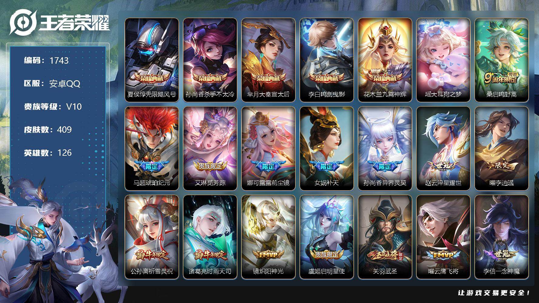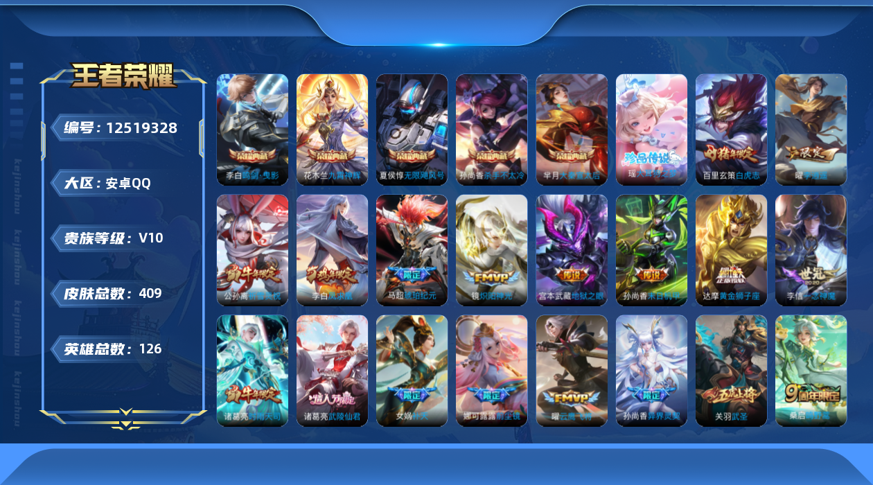 [12519328]【商品标题】:安卓Q-V10-至尊星耀IV段位-126英雄-409皮肤-5典藏-0珍品无双-0无双-1珍品传说-29传说-125史诗